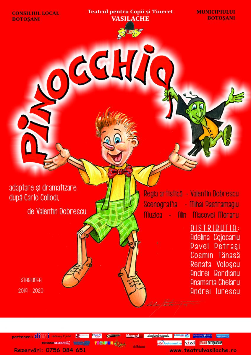 Spectacolul „Pinocchio”, după Carlo Collodi, adaptarea, dramatizarea şi regia artistică este semnată de Valentin Dobrescu. Scenografia îi aparţine lui Mihai Pastramagiu, iar muzica este compusă de Alin Macovei Moraru.