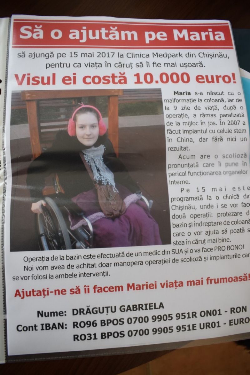 Pe data de 15 mai Maria este programată la Clinica Medpark din Chișinău unde i se vor face două intervenții chirurgicale, respectiv protezare de bazin și îndreptarea coloanei. Pentru bazin, în țara vecină ajunge un medic american care o va opera pro bono.