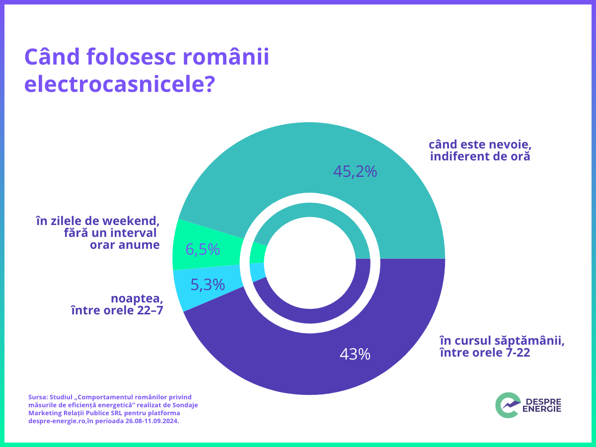 În prezent, conform studiului citat, 45% dintre români declară că utilizează aparatura electrocasnică (mașina de spălat rufe, cea de vase, uscătorul de rufe etc) atunci când au nevoie, indiferent de oră, 43% afirmă că fac acest lucru în cursul săptămânii, în intervalul 07.00-22.00, iar alți 6,5% preferă zilele de weekend, fără a alege un interval orar anume.