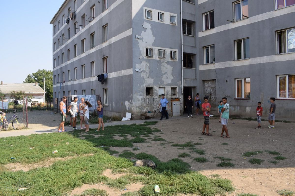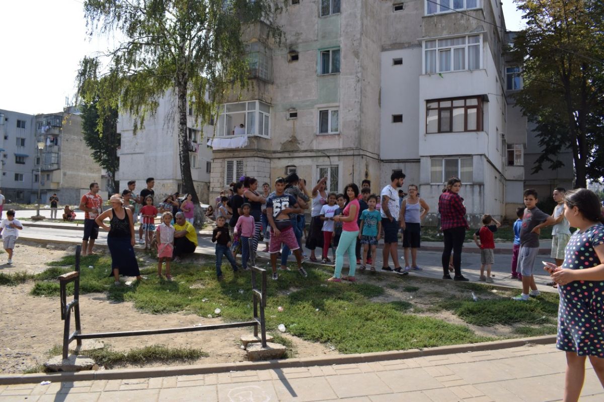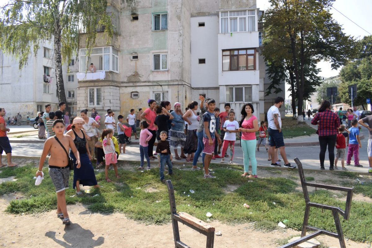 Iar imaginea per ansamblu a fost aceeași. Romii, bărbați, femei și copii s-au adunat în fața blocului gesticulând și vociferând. Alții au rămas în interiorul unuia dintre cele două blocuri care încă o dată șochează prin mizeria incredibilă care se întinde peste tot, de la balustradele de pe scări până la pereți sau tavan.
