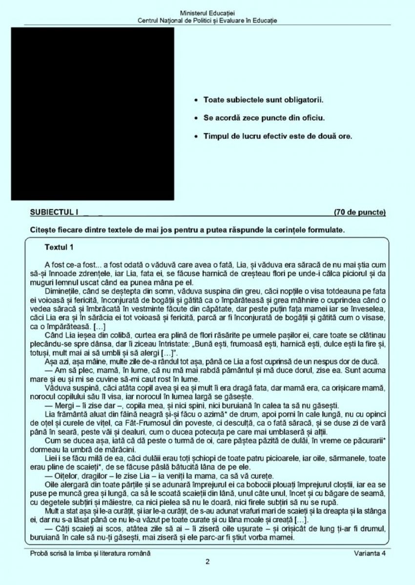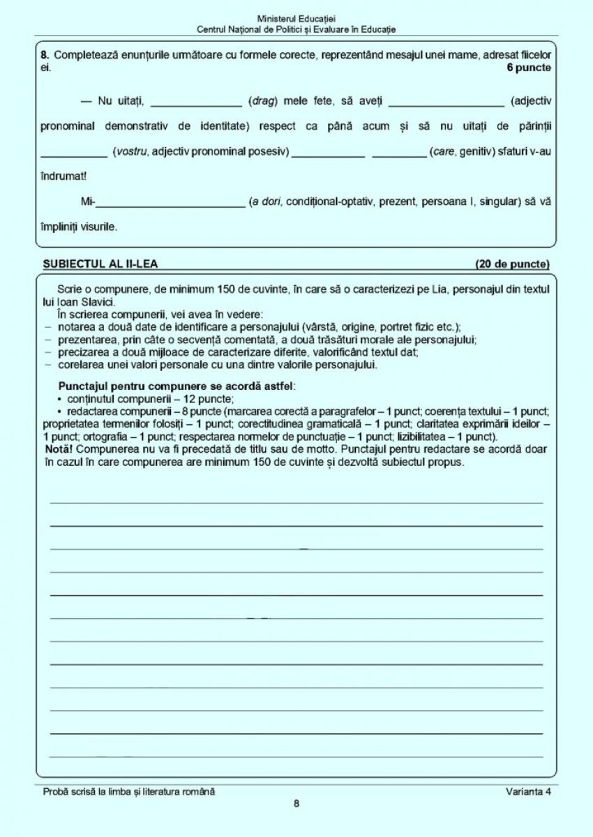 La cel de-al doilea subiect de la Evaluare Naţională 2023, elevii de clasa a VIII-a au avut de scris o compunere, de minimum 150 de cuvinte, în care să o caracterizeze pe Lia, personajul din textul lui Ioan Slavici.