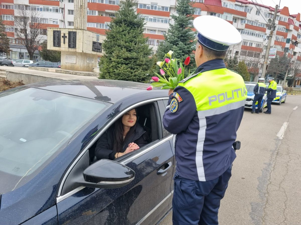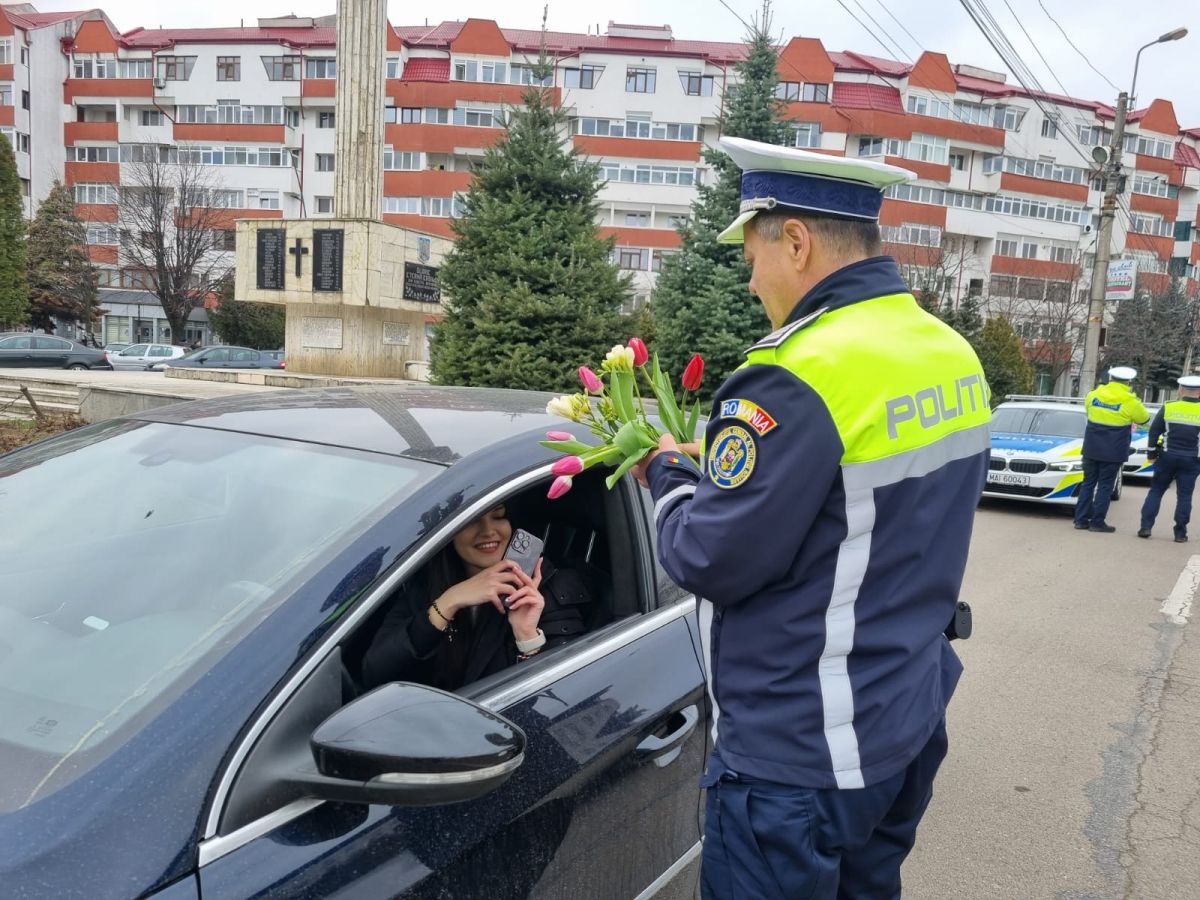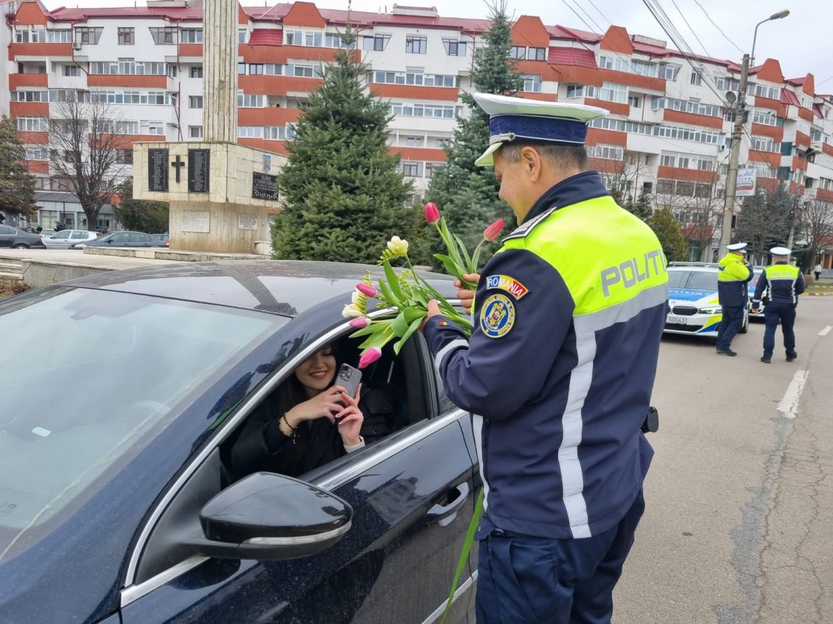 Protagoniști au fost o tânără și tatăl ei polițist. Oamenii legii au organizat de 8 martie o altfel de acțiune. Și anume au împărțit în trafic flori tuturor șoferițelor.