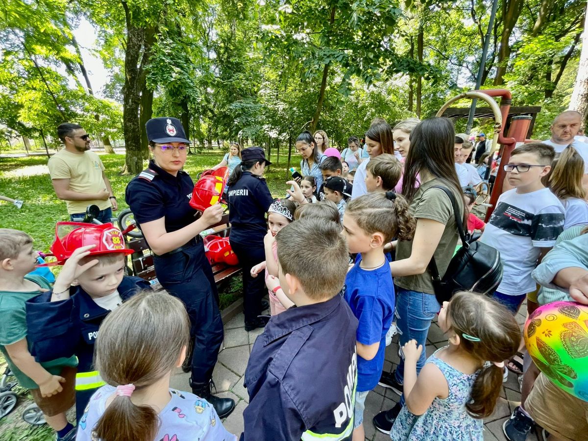 Copiii care nu au ajuns în fața Prefecturii Botoșani s-au întâlnit cu pompierii în Parcul Mihai Eminescu din municipiul Botoșani.