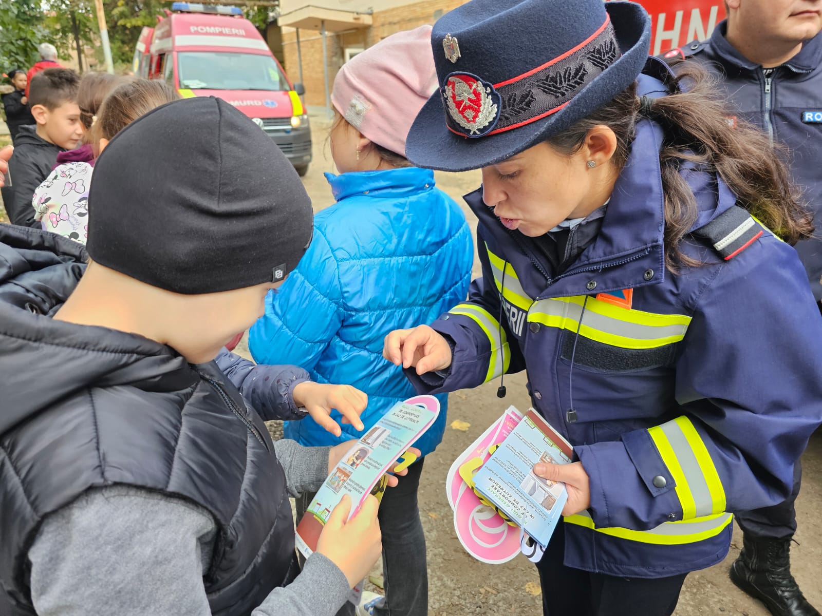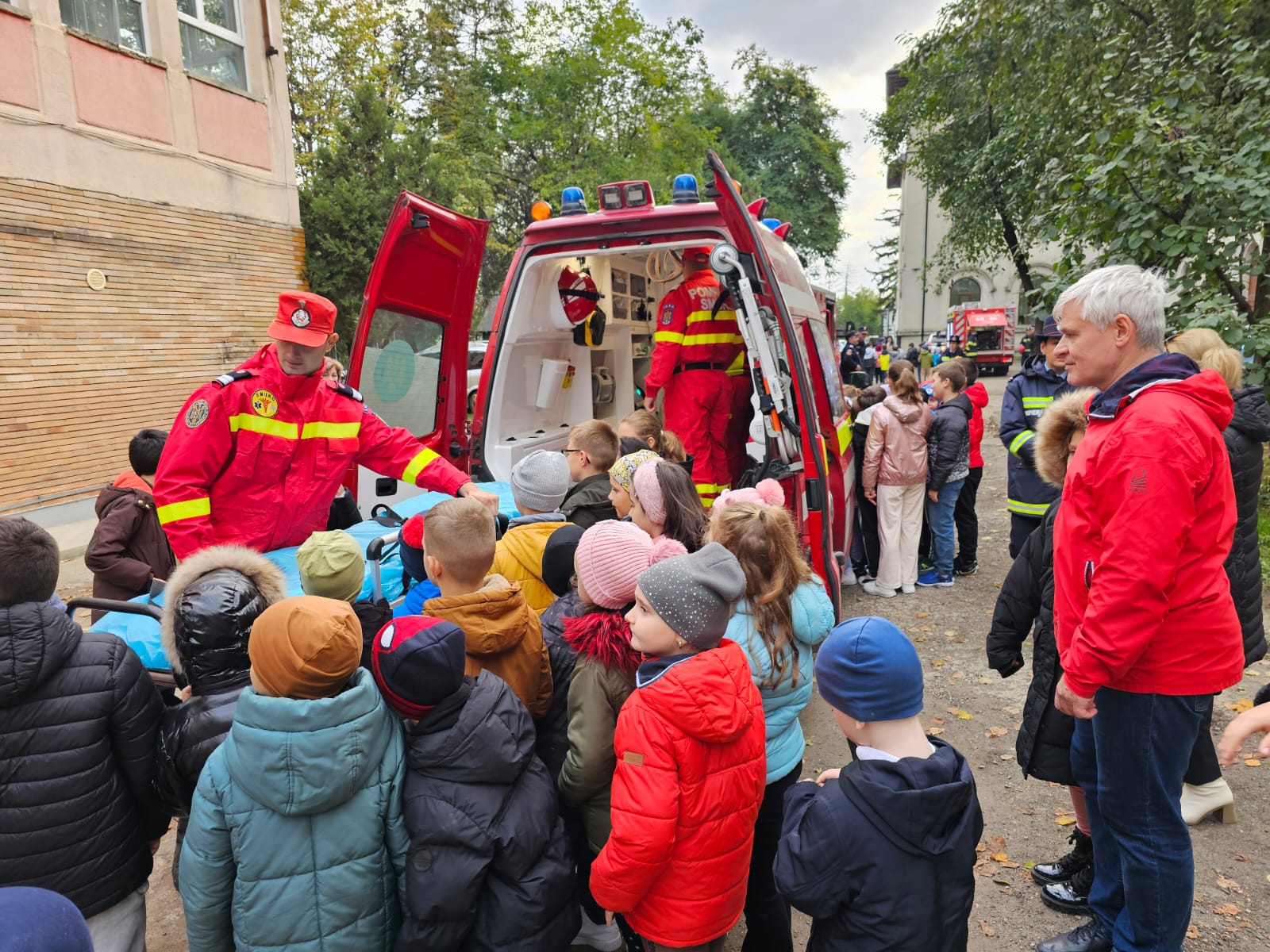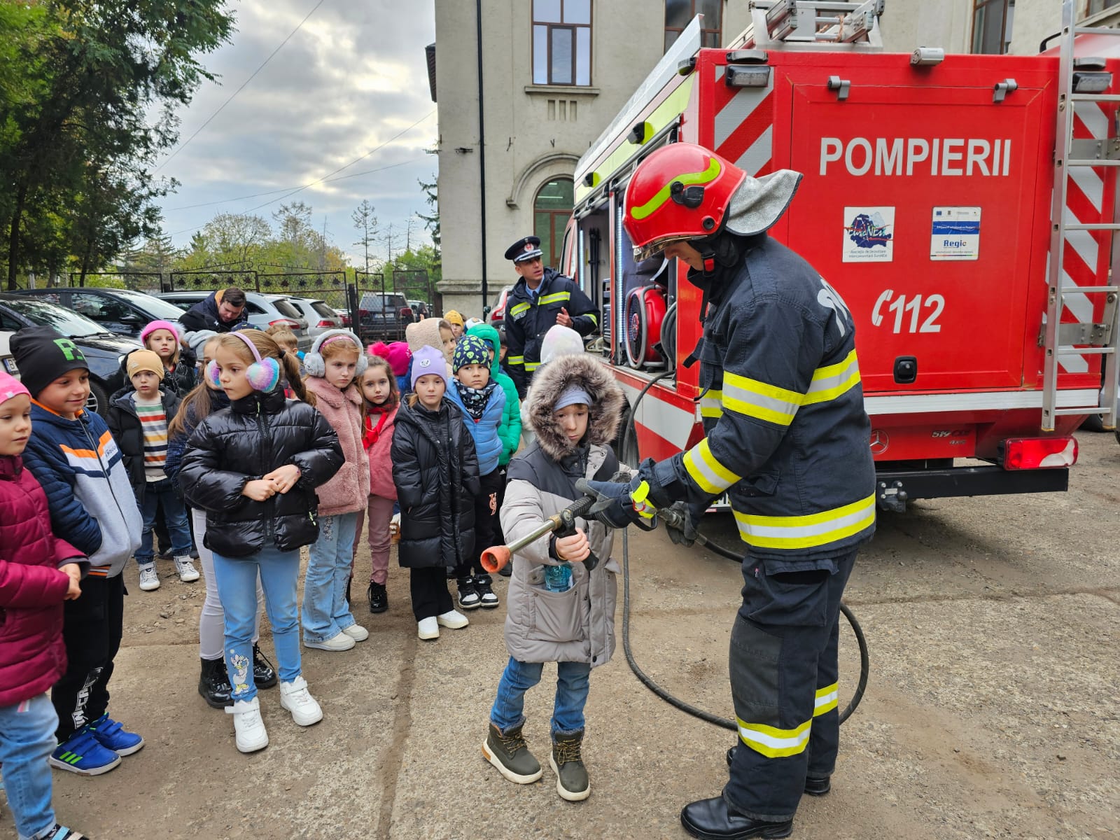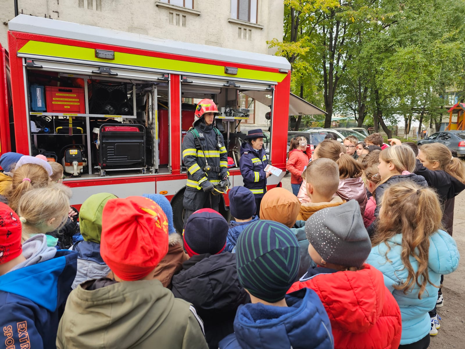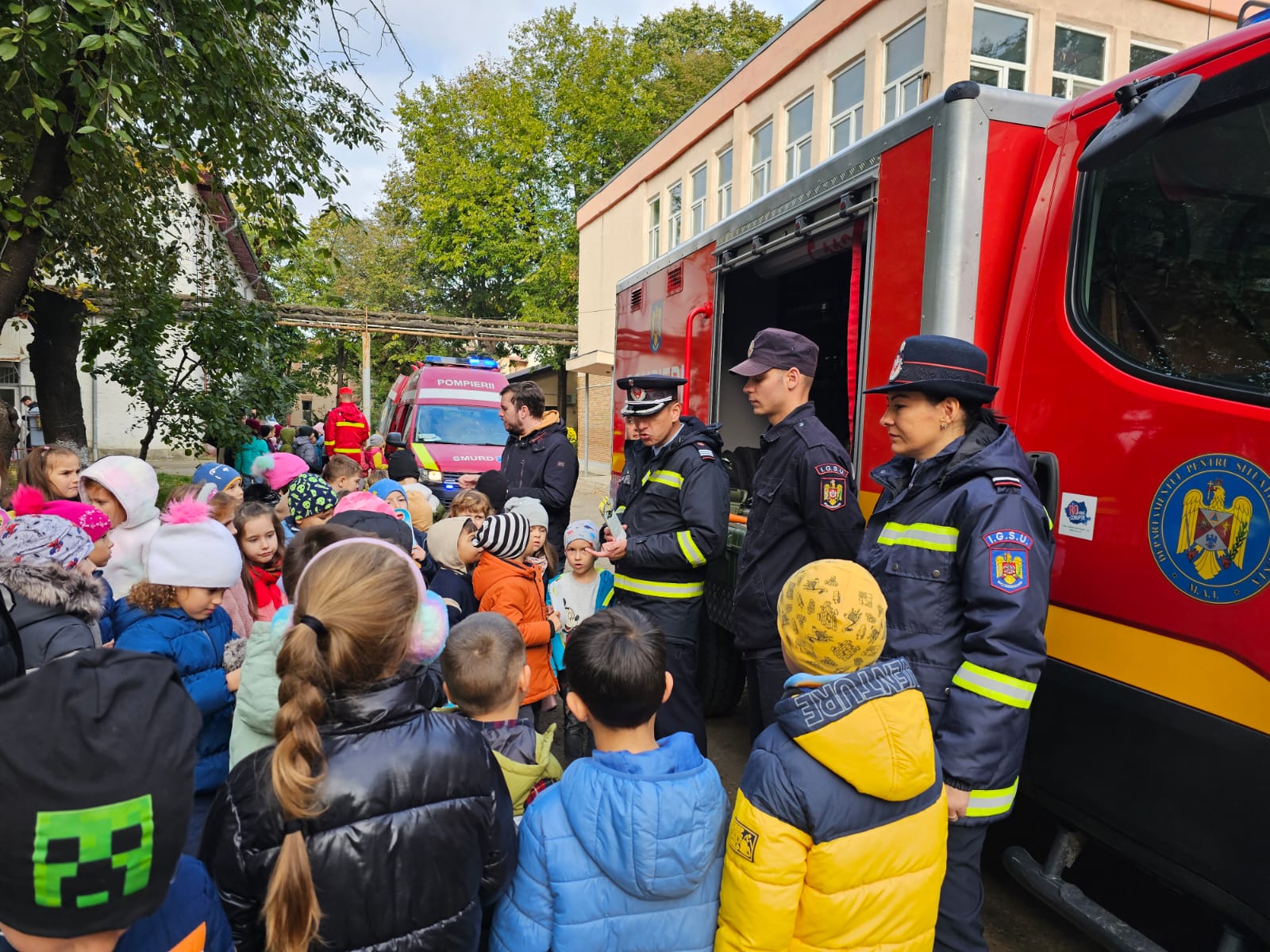 Copiii au avut ocazia să studieze, îndeaproape, autospecialele folosite în misiunile pirotehnice, de stingere a incendiilor sau acordare a primului ajutor și au ascultat cu interes cum funcționează fiecare accesoriu, în parte.
