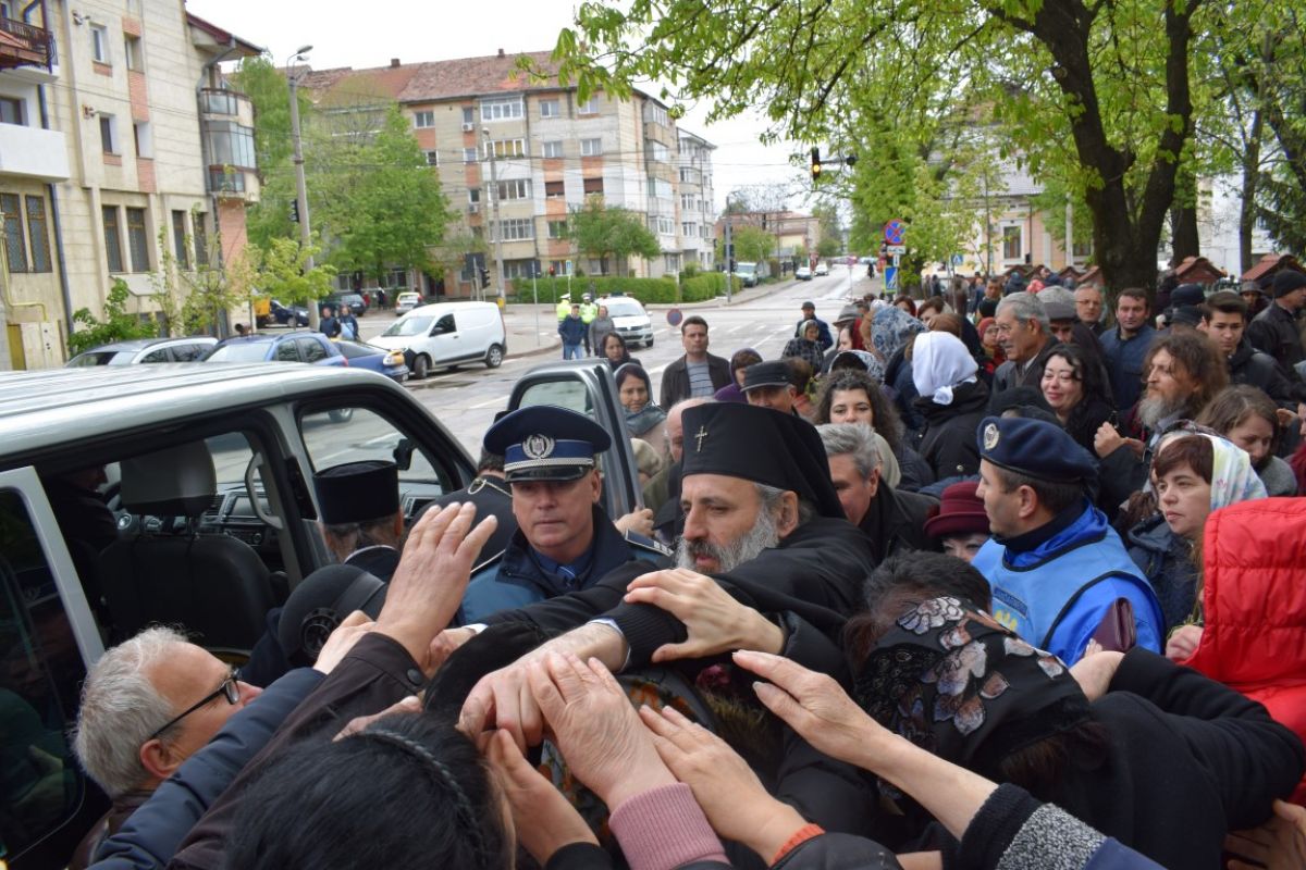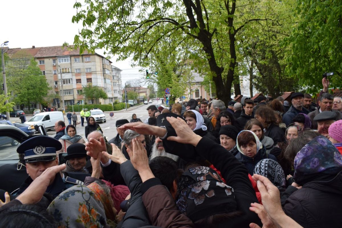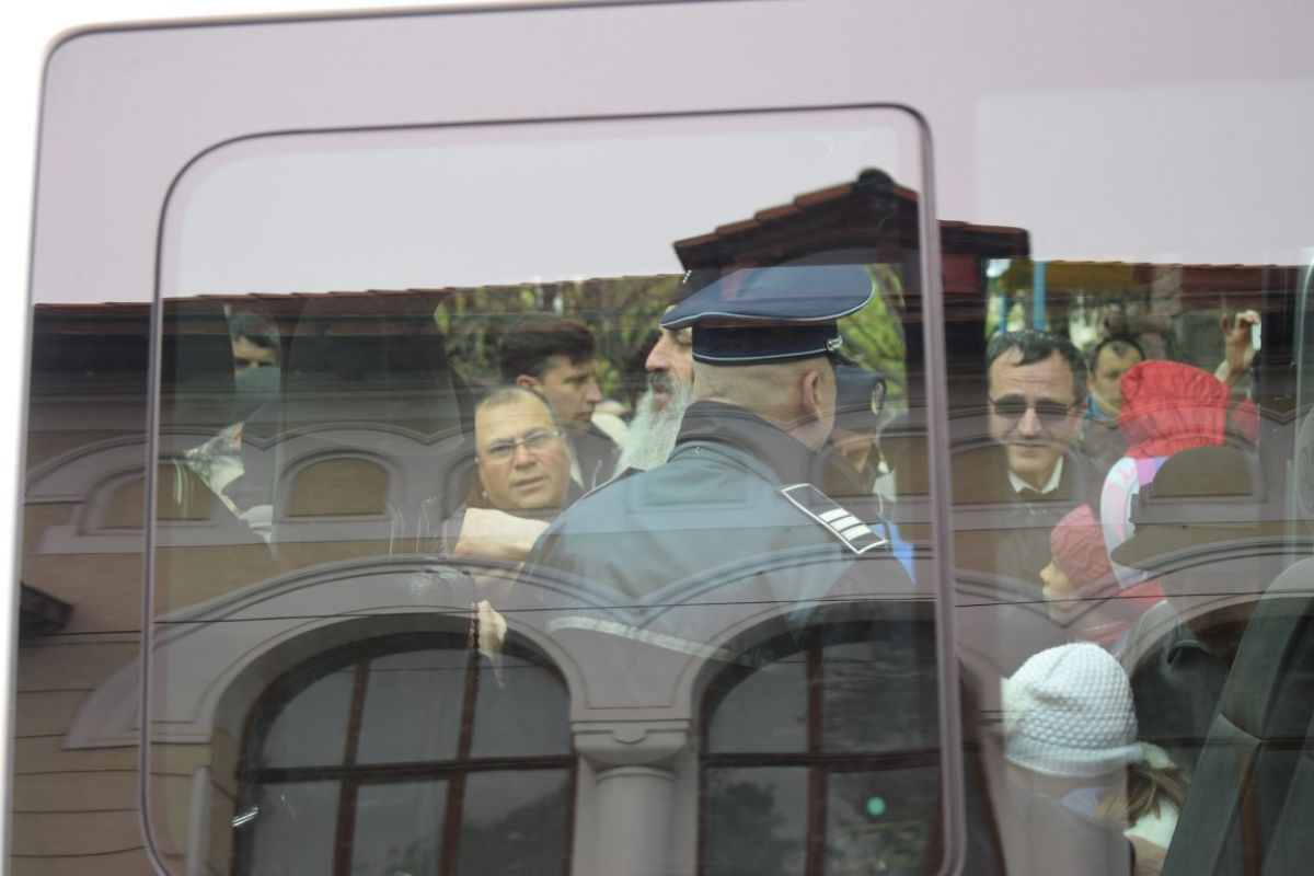 La fel s-a întâmplat și la plecare, drumul spre mașină fiind unul anevoios din cauza oamenilor care se zbăteau să ajungă la Sfinția Sa. Au intervenit polițiștii pentru a-l ajuta să urce în mașină.