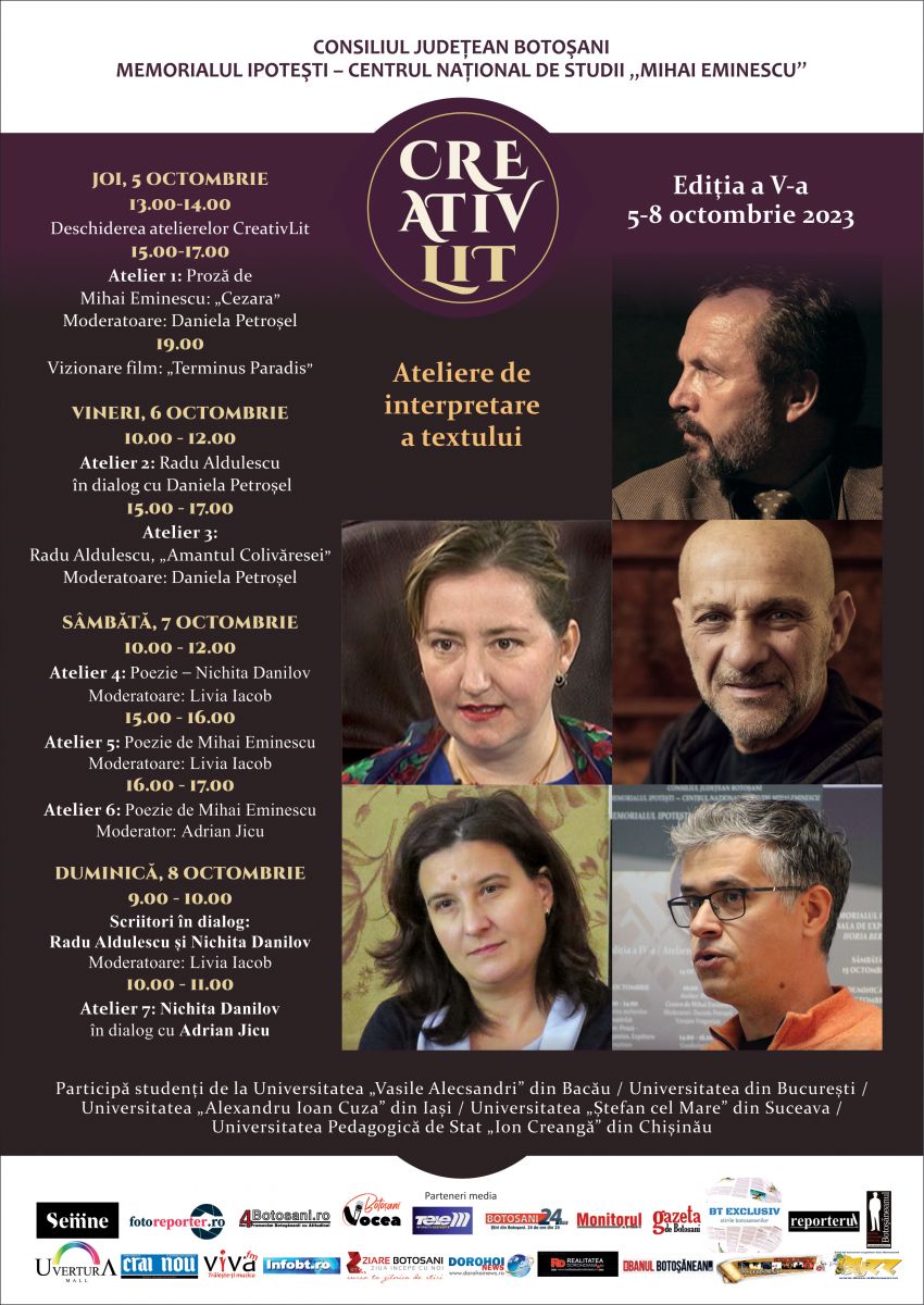 Memorialul Ipotești – Centrul Național de Studii „Mihai Eminescu”, instituție din subordinea Consiliului Județean Botoșani, organizează, în perioada 5-8 octombrie 2023, a V-a ediție a Taberei de interpretare a textului CreativLit, proiect ale cărui obiective sunt, pe de o parte, promovarea operei eminesciene și, pe de altă parte, medierea dialogului cu scriitorii contemporani.
