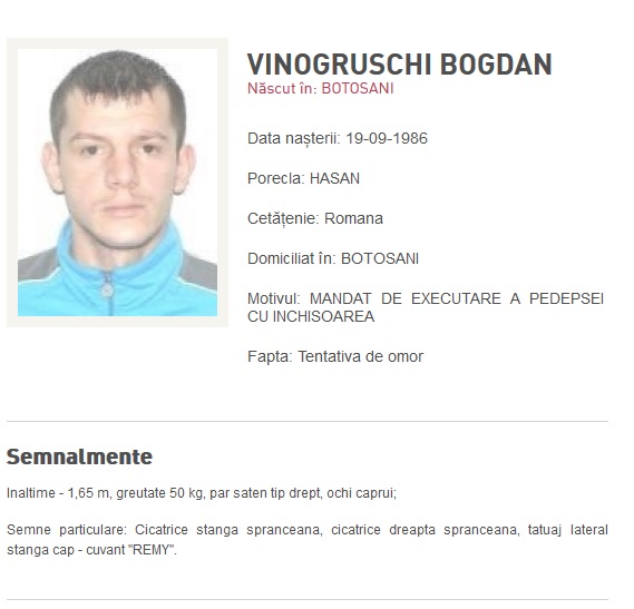Bogdan Vinogruschi, născut pe data de 19 septembrie 1986 se află pe lista celor mai căutați infractori din țară, pentru tentativă de omor. Pentru această faptă, botoșăneanul are un mandat de executare a pedepsei cu închisoarea. Tânărul are o înălțime de 1,65 m, greutate 50 kg, păr saten tip drept, ochi caprui. Semne particulare: Cicatrice stângă sprânceană, cicatrice dreapta sprânceană, tatuaj lateral stânga cap - cuvânt "REMY". Dacă va fi prins de oamenii legii botoșăneanul va sta zece ani după gratii pentru comiterea infracțiunii de tentativă de omor deosebit de grav.