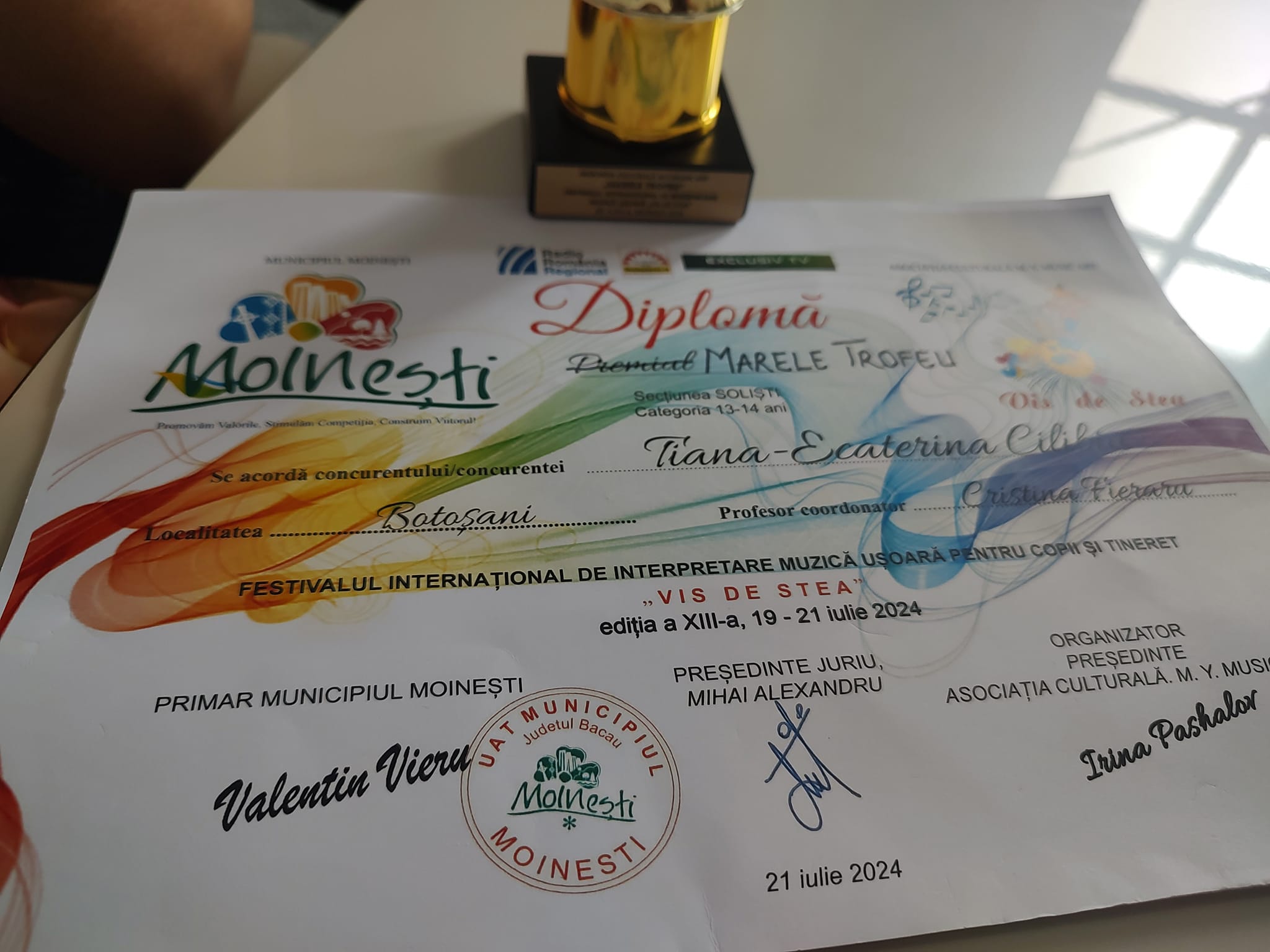 Moinești, 21 iulie 2024 – Ediția a XIII-a a Festivalului Internațional „Vis de Stea”, desfășurată între 19 și 21 iulie 2024 în Moinesti, Bacău, s-a încheiat într-o notă strălucitoare, cu Tiana Cilibiu, o tânără artistă din Botoșani, câștigând Marele Trofeu al competiției.