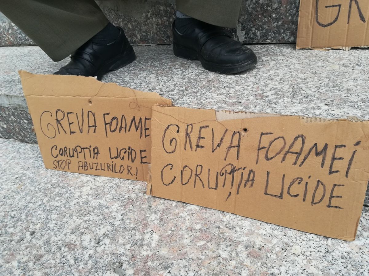 „Corupţia ucide”, „greva foamei”, „stop abuzurilor”, se putea citi pe nişte cartoane aşezate pe esplanada Palatului Administrativ.
