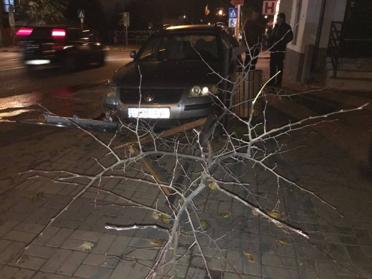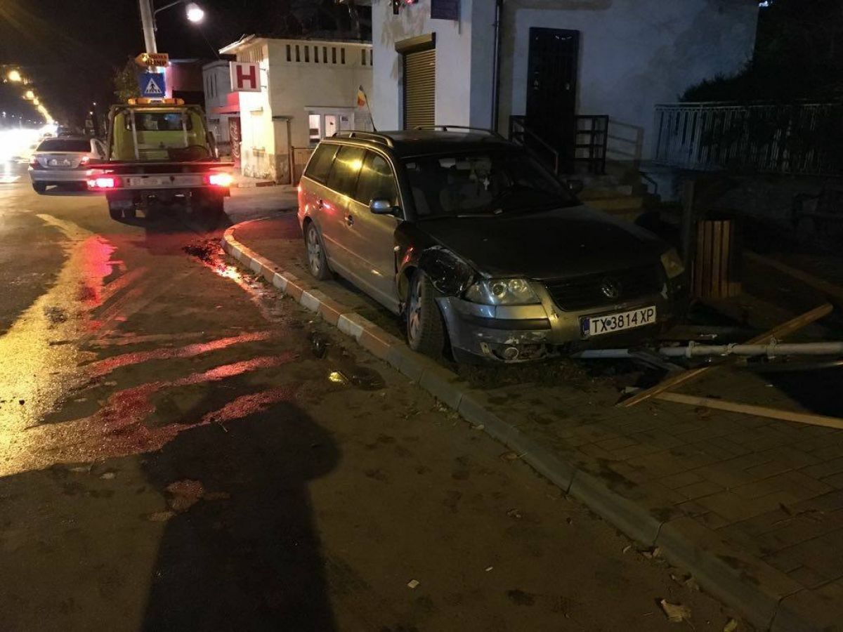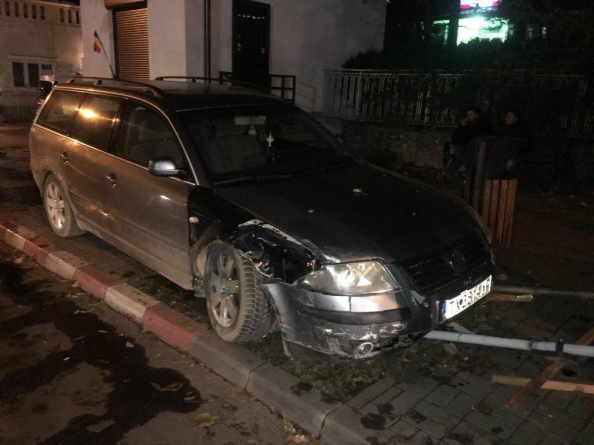 Impactul a fost unul destul de puternic pentru că mașina VW a fost aruncată pe trotuar unde s-a izbit într-un indicator rutier. Pe trotuar nu se afla nimeni, din fericire.