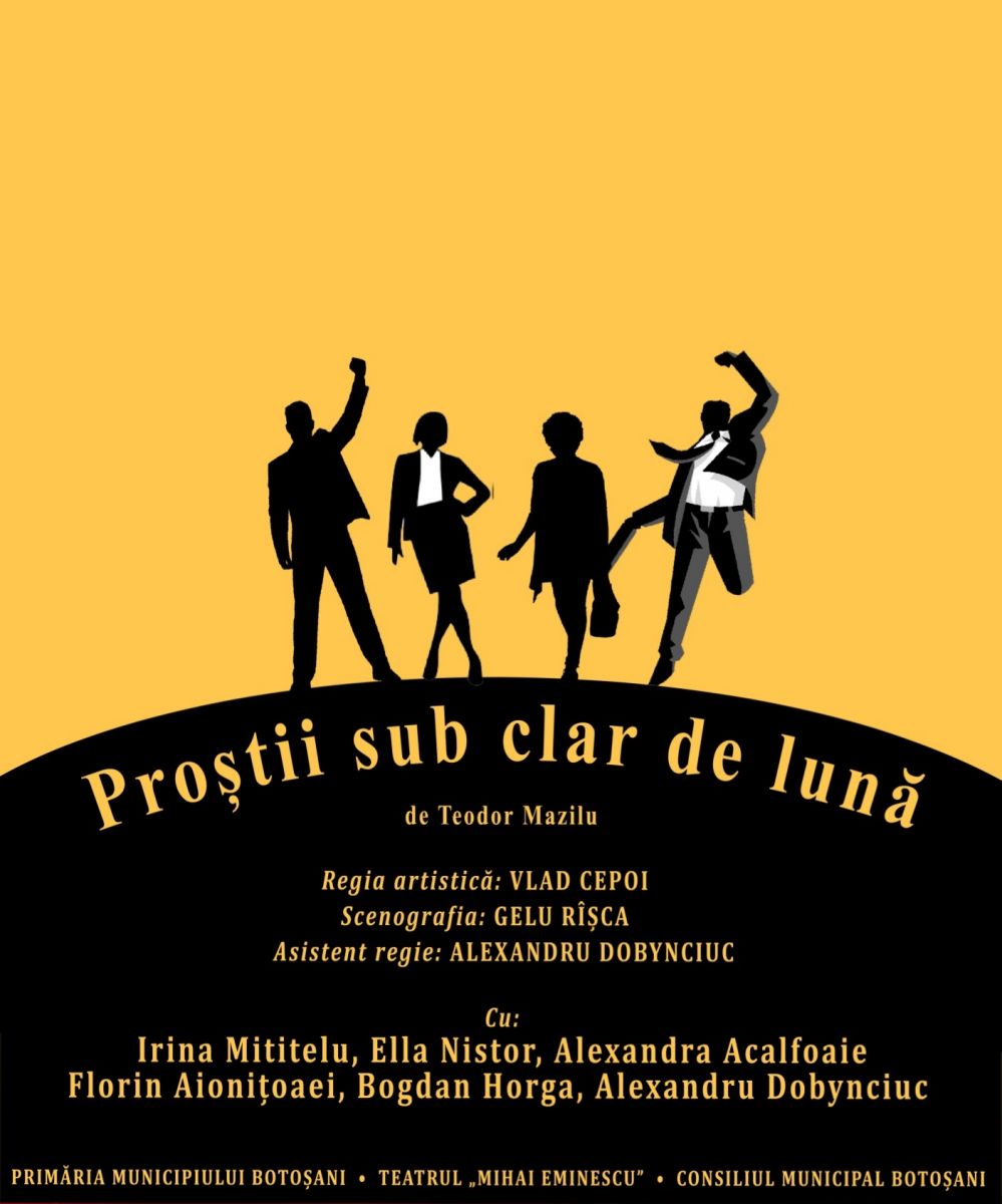 Sâmbătă, 27 noiembrie, ora 18:00, Teatrul ”Mihai Eminescu” Botoșani a programat spectacolul ”Proștii sub clar de lună”, de Teodor Mazilu.