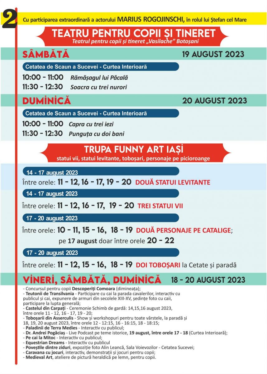 În perioada 19 – 20 august 2023 la Cetatea de Scaun a Sucevei, curtea interioară, vor fi pus în scenă spectacolele „Rămăşagul lui Păcală", „Soacra cu trei nurori", „Capra cu trei iezi" şi „Punguţa cu doi bani".