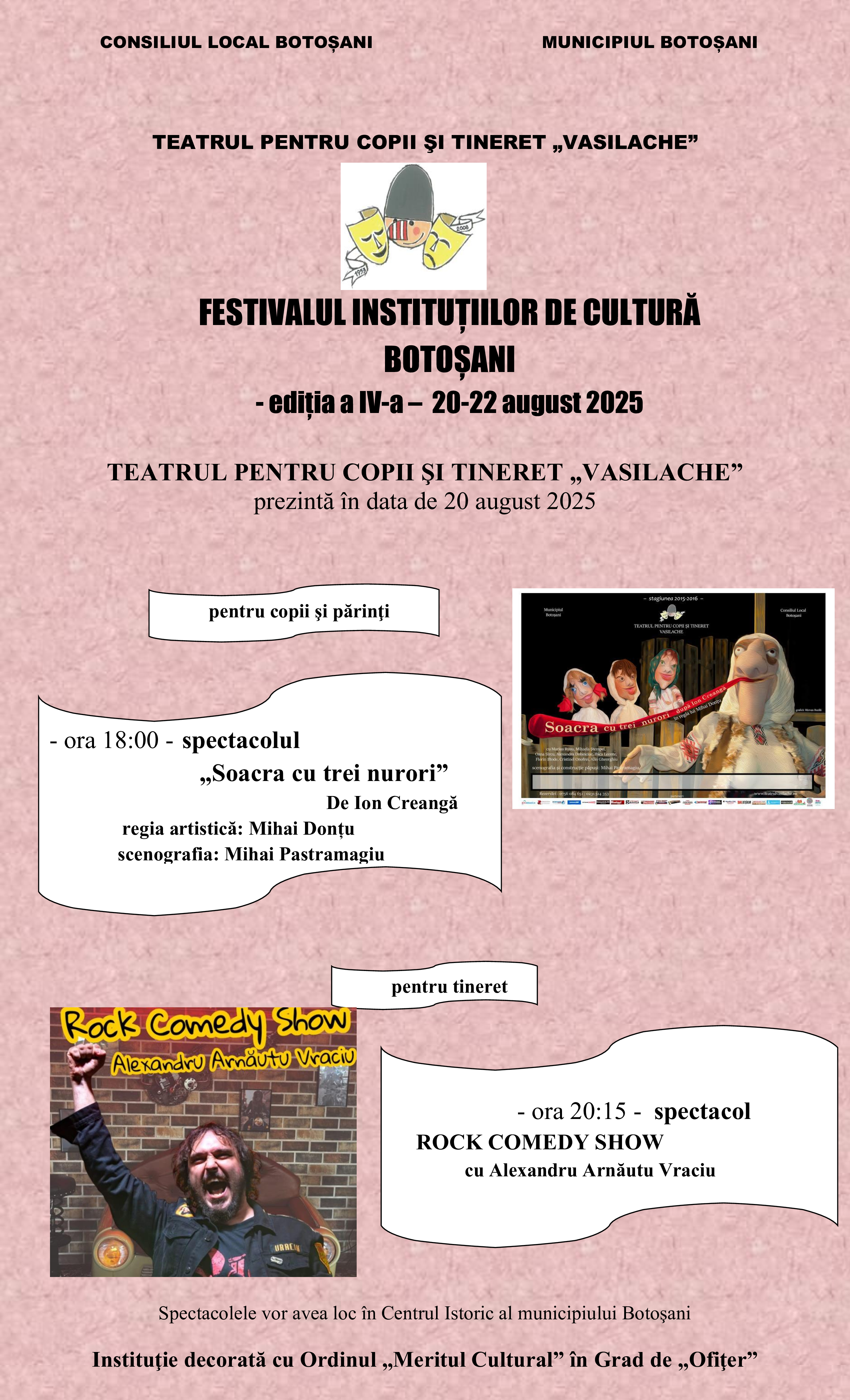 Teatrul pentru Copii şi Tineret „Vasilache" vă invită miercuri, 20 august 2025, în centrul istoric al municipiului Botoşani să vizionaţi două spectacole de excepţie ce vor fi prezentate la cea de a IV-a ediţie a Festivalului Instituţiilor de Cultură Botoşani, organizat de către Filarmonica „George Enescu" Botoşani, în colaborare cu Teatrul ,Mihai Eminescu" Botoşani şi Teatrul pentru Copii şi Tineret,,Vasilache" Botoşani, cu sprijinul Primăriei municipiului Botoşani.
