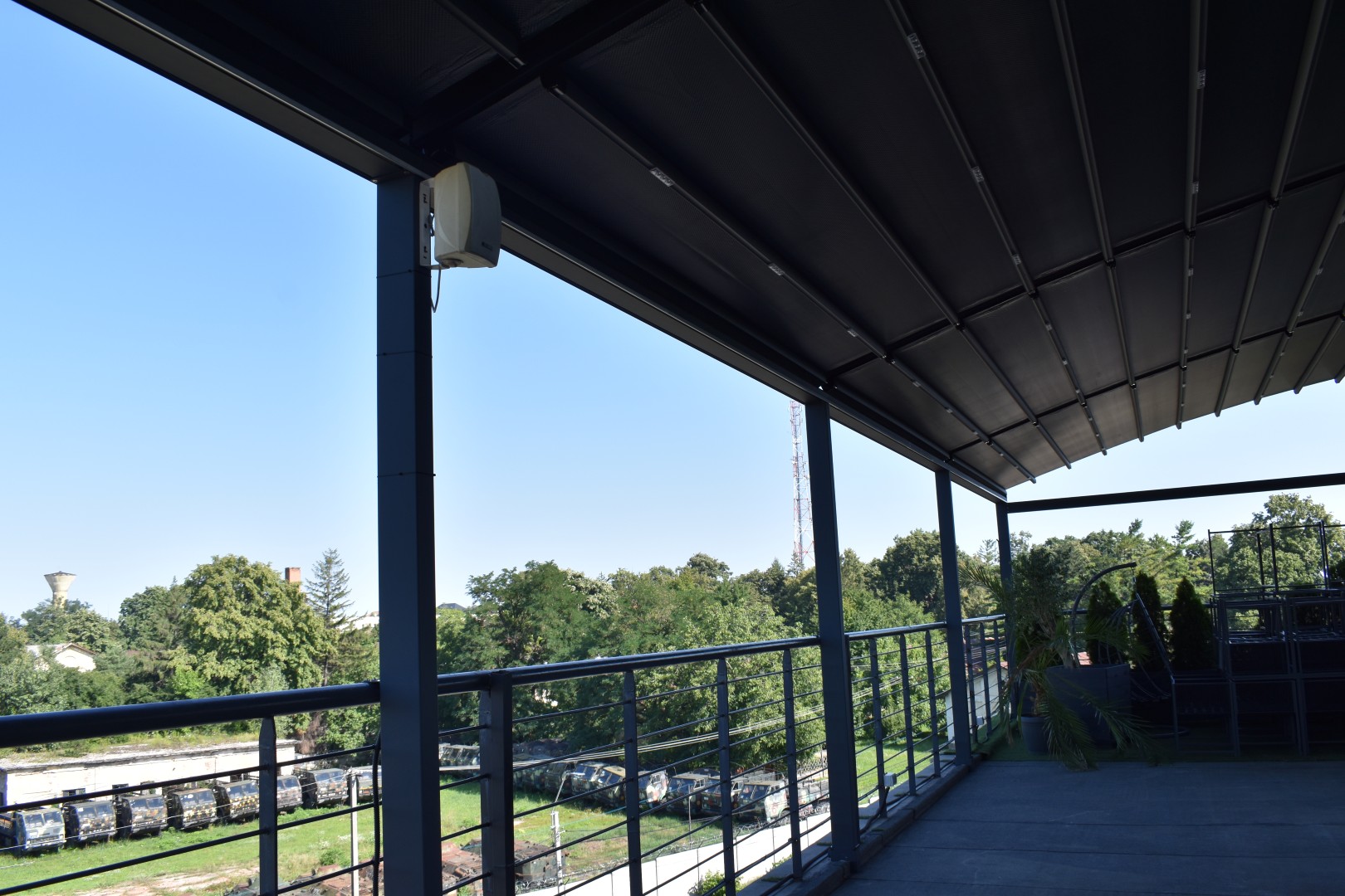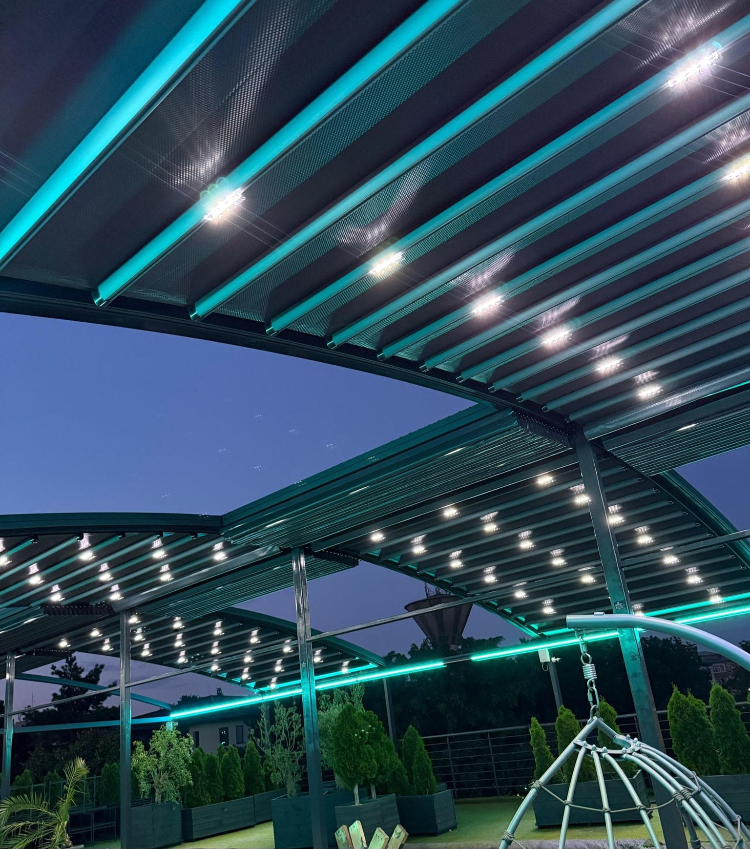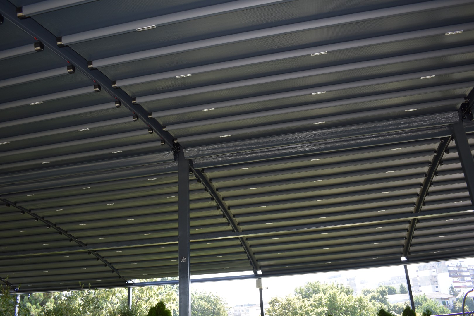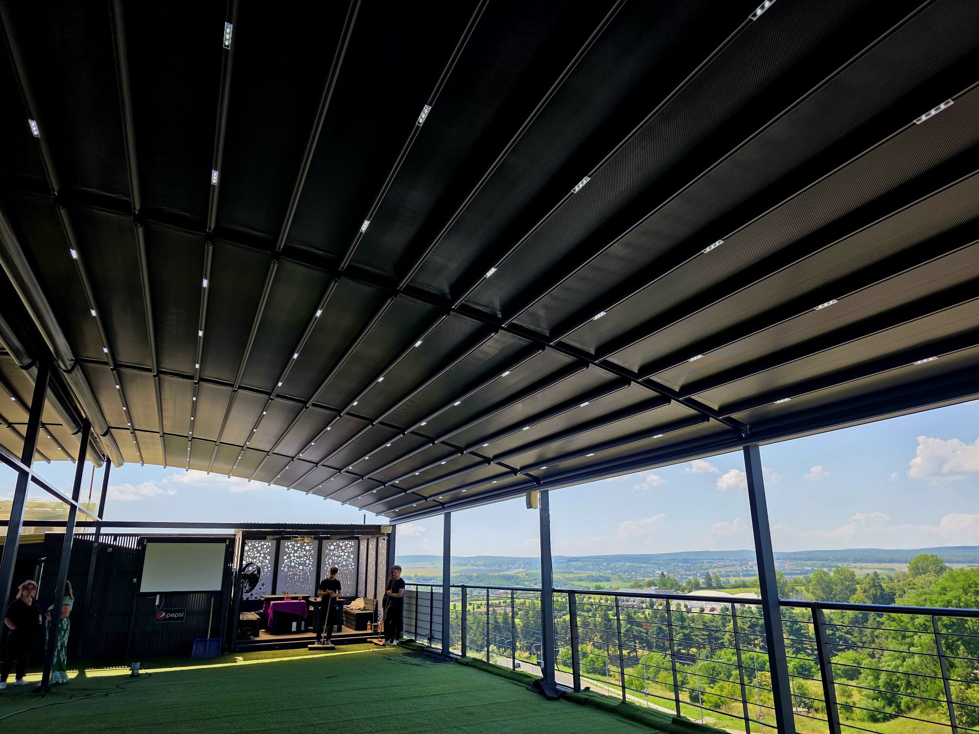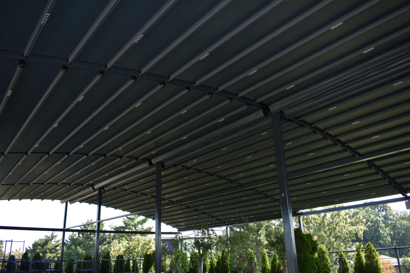Iar asta este posibil deoarece este montată o pergola retractabilă de 2,8 și 4 metri înălțime, manevrată la telecomandă și iluminată cu un sistem Samsung. Astfel, locația este protejată de soare și ploaie, permițând utilizarea terasei pe tot parcursul anului.