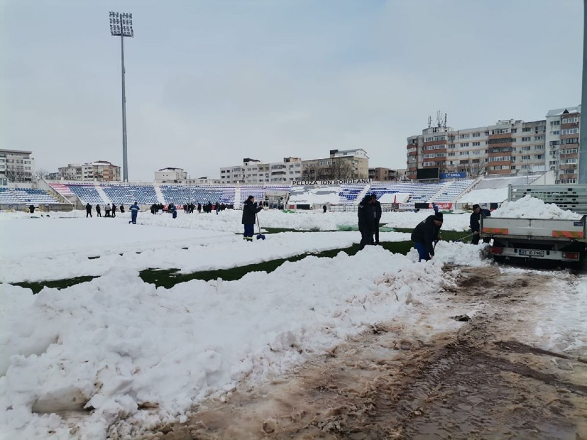 FC Botoşani a anunţat, vineri, că pentru ca partida cu FC Argeş de duminică să se desfăşoare în cele mai bune condiţii, terenul este deszăpezit de reprezentanţi ai Direcţiei pentru Sport şi Agrement şi de deţinuţi de la Penitenciarul Botoşani.