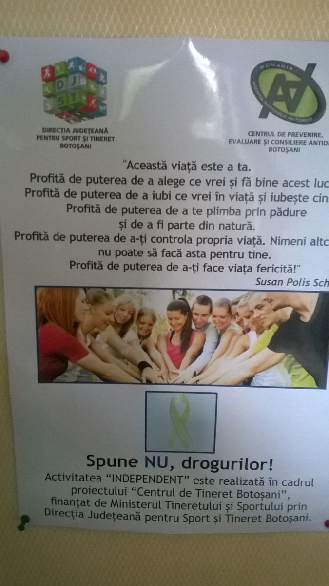 Miercuri, 28 septembrie 2016, s-a desfășurat activitatea de informare a tinerilor din cadrul proiectului „Independent” derulat de către Direcția Județeană pentru Sport și Tineret Botoșani-Centrul de Tineret în parteneriat cu Centrul de Prevenire, Evaluare și Consiliere Antidrog Botoșani și Palatul Copiilor Botoșani, cu finanțare de la Ministerul Tineretului și Sportului.