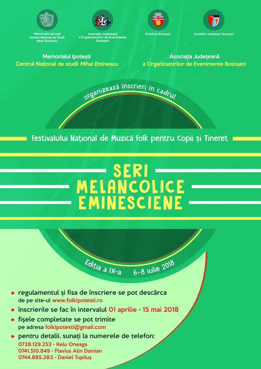 Memorialul Ipoteşti – Centrul Naţional de Studii Mihai Eminescu, şi Asociaţia Judeţeană a Organizatorilor de Evenimente Botoşani, organizează înscrieri în cadrul Festivalul Naţional de muzică folk pentru copii şi tineret Seri melancolice eminesciene, ediţia a IX-a 6-8 iulie 2018.
