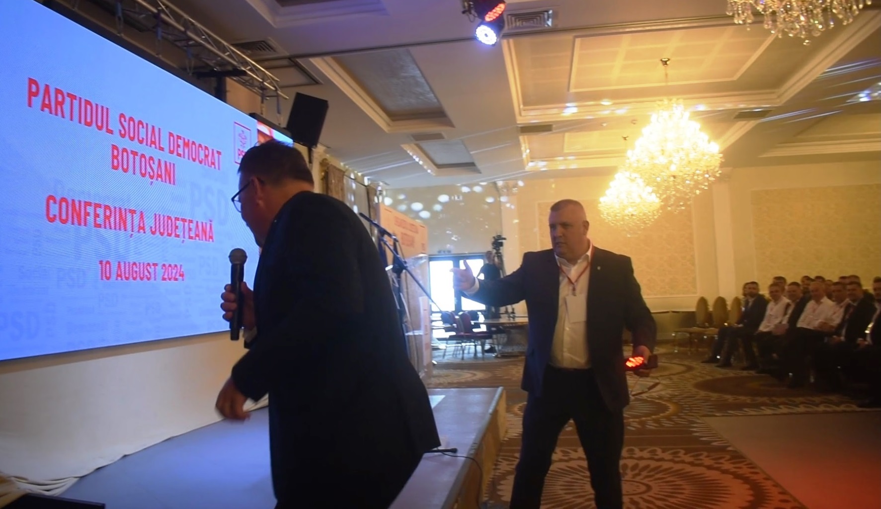 Relu Tîrzioru i-a cerut prim-vicepreședintelui PSD Botoșani să predea microfonul și să urce pe scenă, însă acesta a refuzat: ”Vreau să stau aici, ați fost voi foarte mulți aici. Eu...”  (vezi video mai jos)