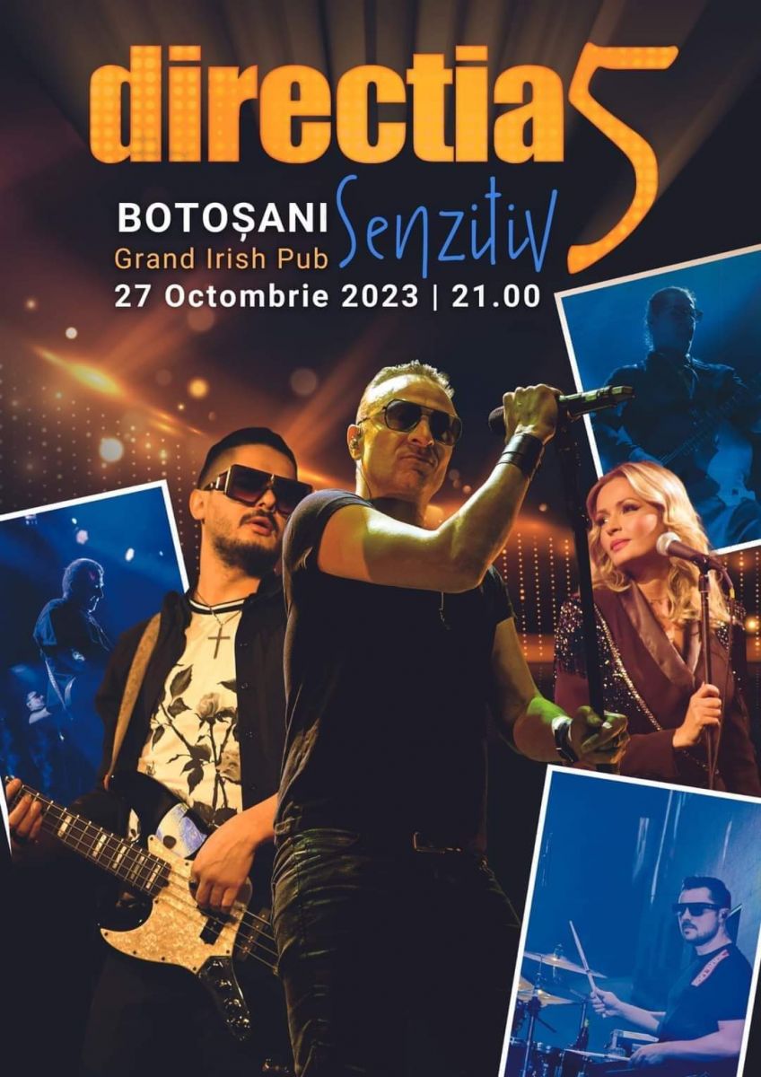 Pentru această toamnă organizatorii au pregătit o serie de evenimente adresate botoșănenilor. Direcția 5 vine la Irish Pub cu concertul „Senzitiv” programat pentru seara zilei de 27 octombrie 2023, de la ora 21:00.