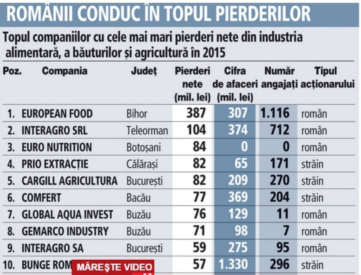 Locul secund în topul pierderilor din industria alimentară şi agricultură este ocupat de Interagro SRL, companie din grupul cu acelaşi nume controlat de omul de afaceri Ioan Niculae. Compania, intrată la începutul anului în insolvenţă, a avut în 2015 o pierdere netă de 104 milioane de lei. Tot pe minus a fost şi cealaltă mare companie din grupul lui Ioan Niculae, Interagro SA, care a realizat o pierdere netă de 59 milioane de lei.