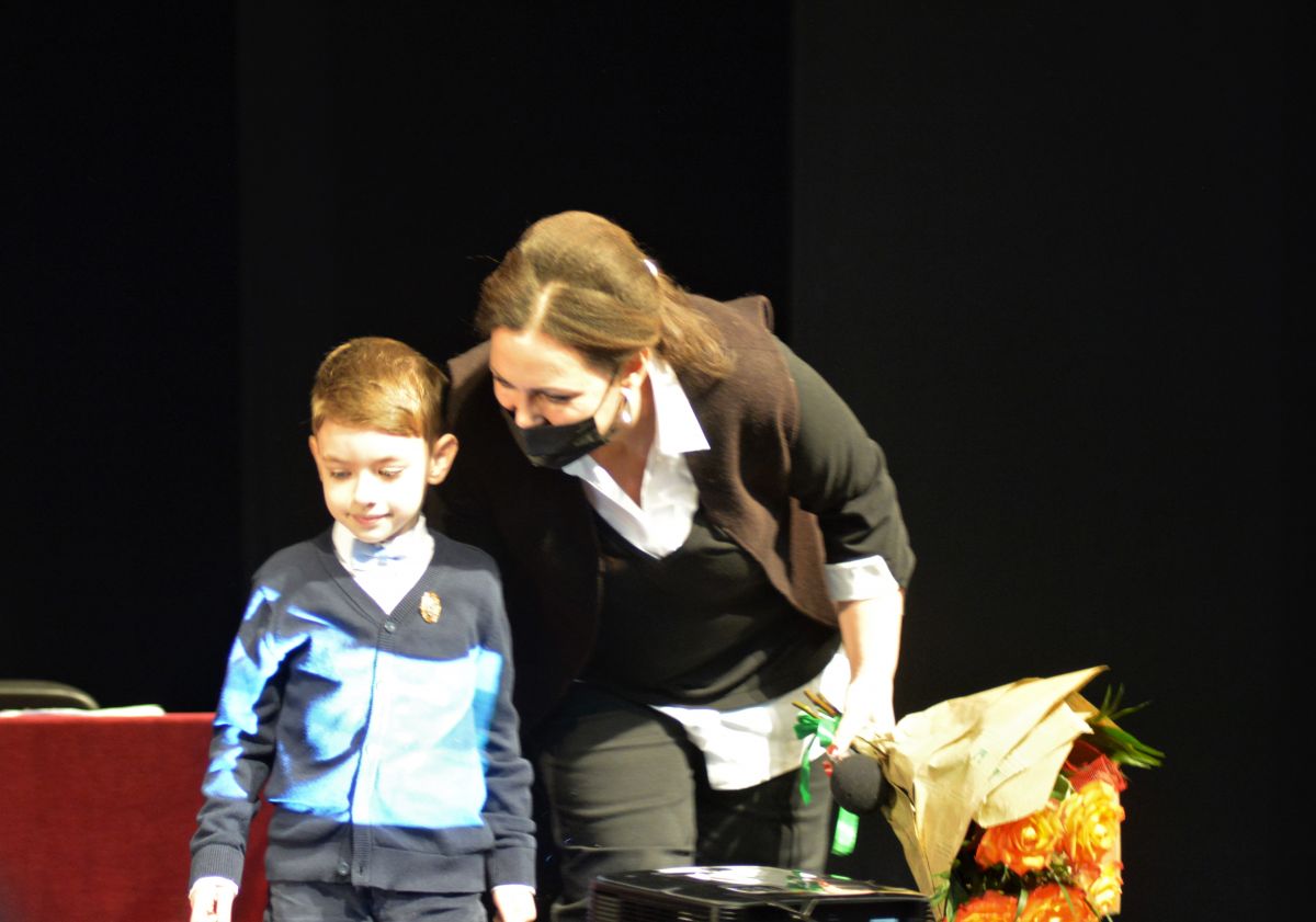 În marginea sălii, pe al doilea rând, băiețelul încă are emoții. Își îmbracă haina și răspunde politicos celor câțiva oameni care merg să îl felicite.