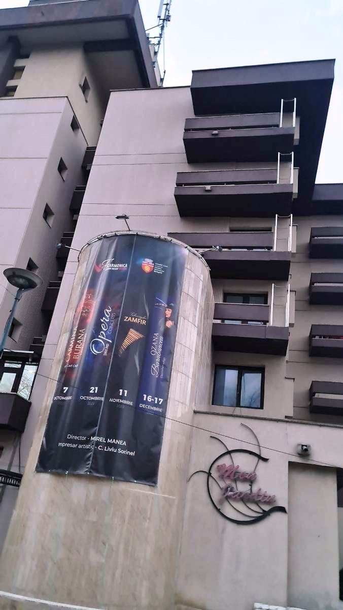 În afara afișelor pe care ne-am obișnuit de multă vreme să le vedem pe la avizierele din oraș, au fost amplasate două mesh-uri de dimensiuni generoase pe Casa de Cultură a Sindicatelor și Hotel Rapsodia, care prezintă cele mai importante spectacole din această toamnă: Carmina Burana, Opera Concerts dirijat de Daniel Jinga, Gheorghe Zamfir și concertele de sărbători cu Ozana Barabancea la pupitru.
