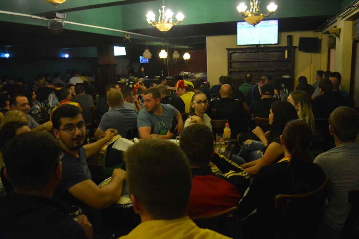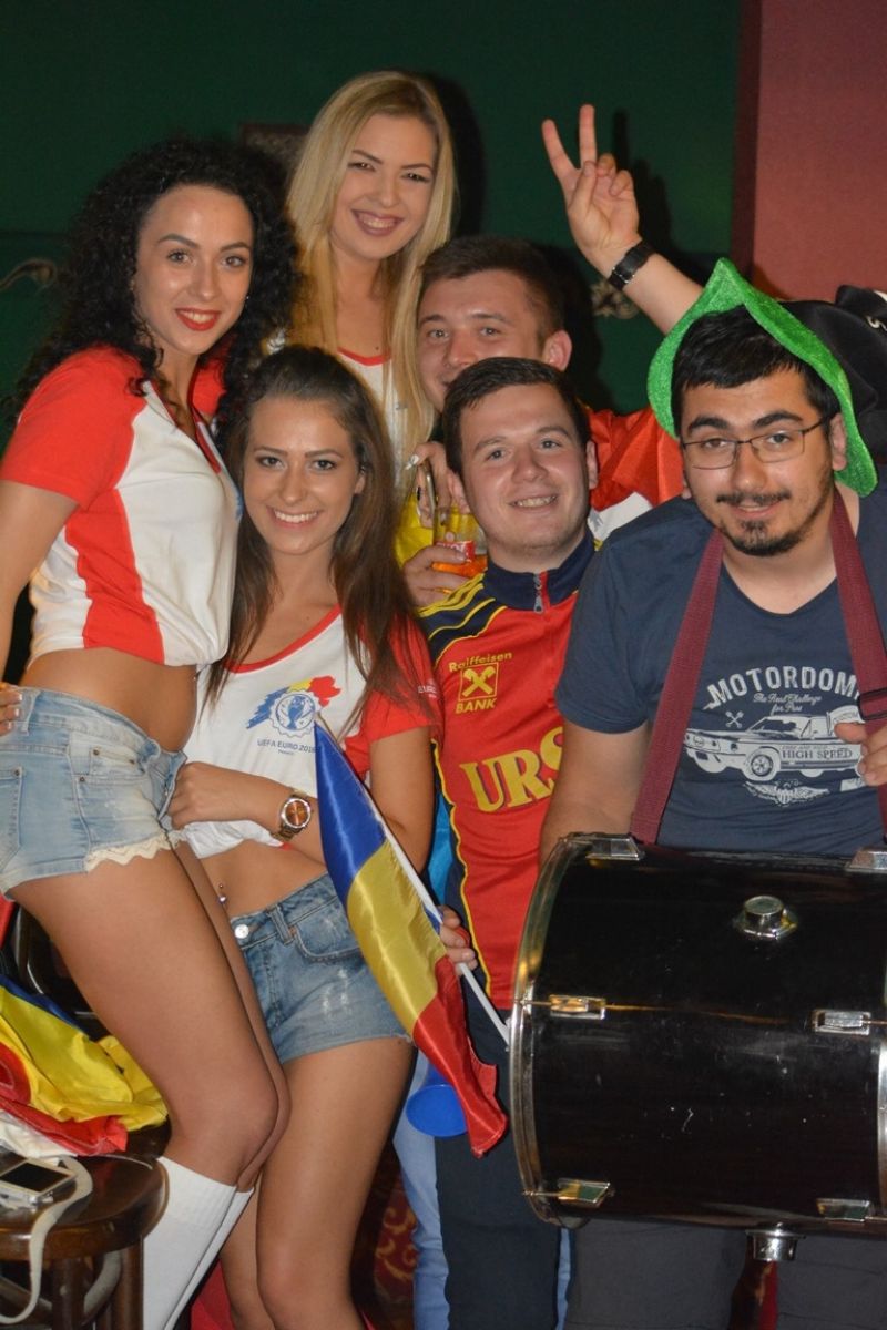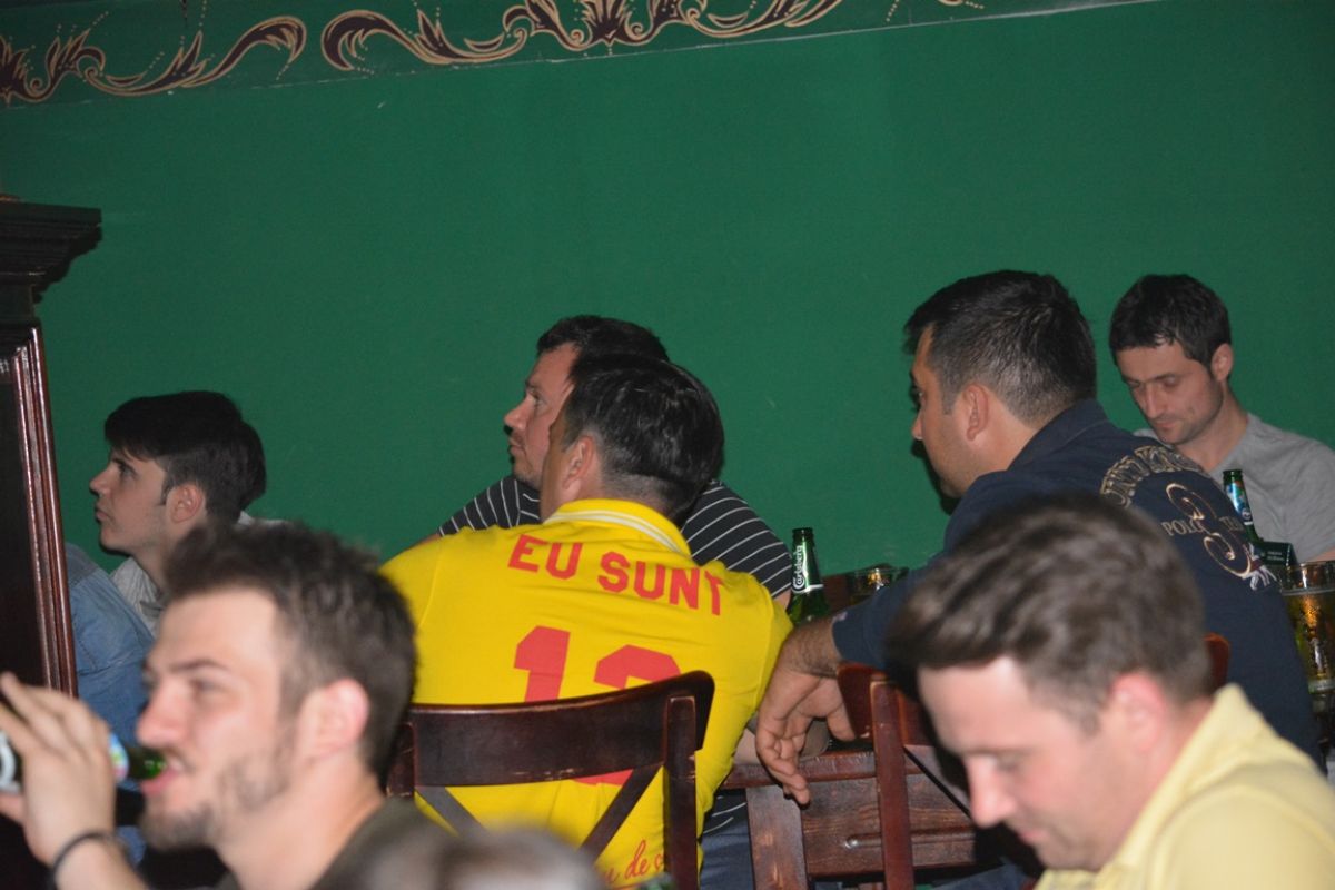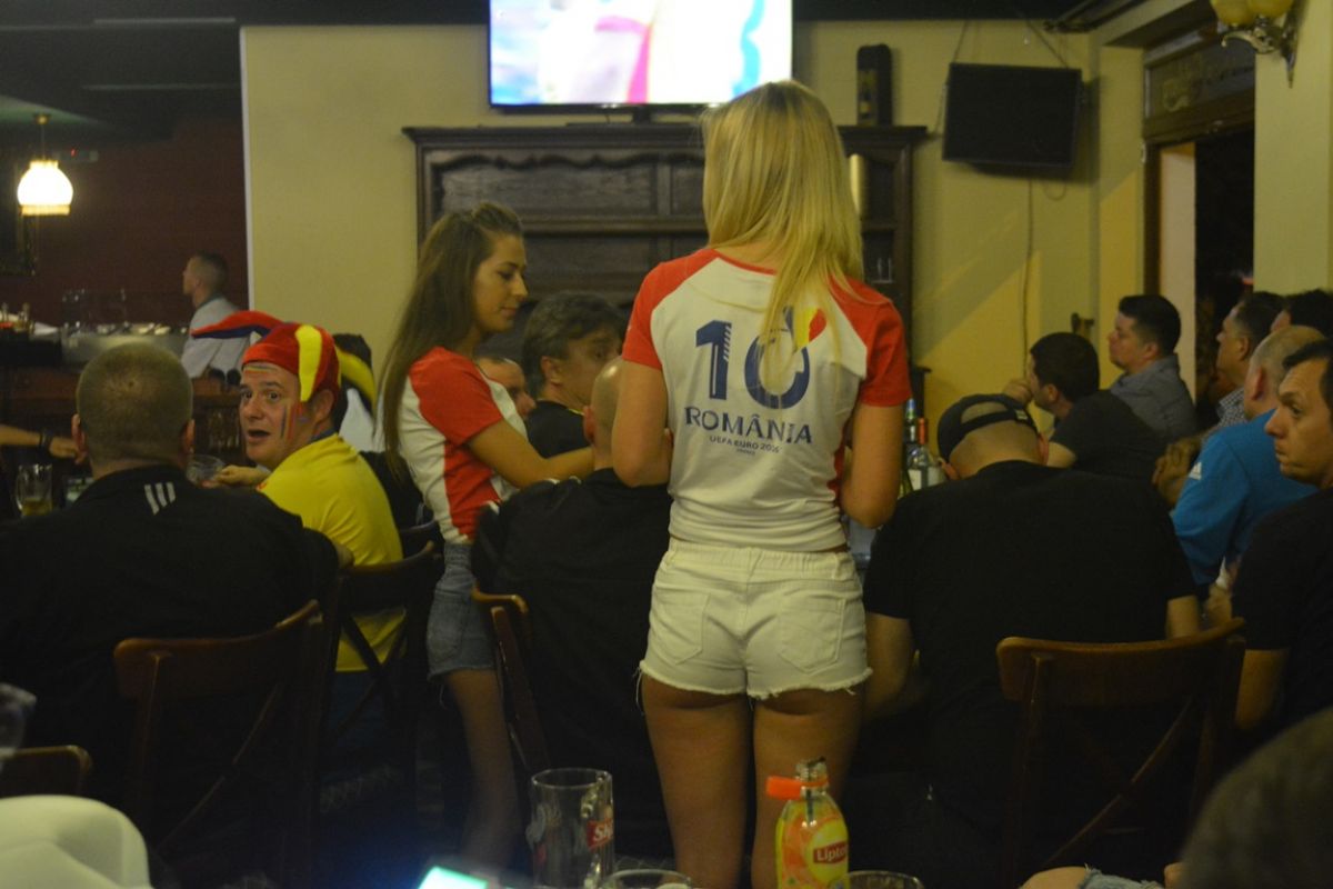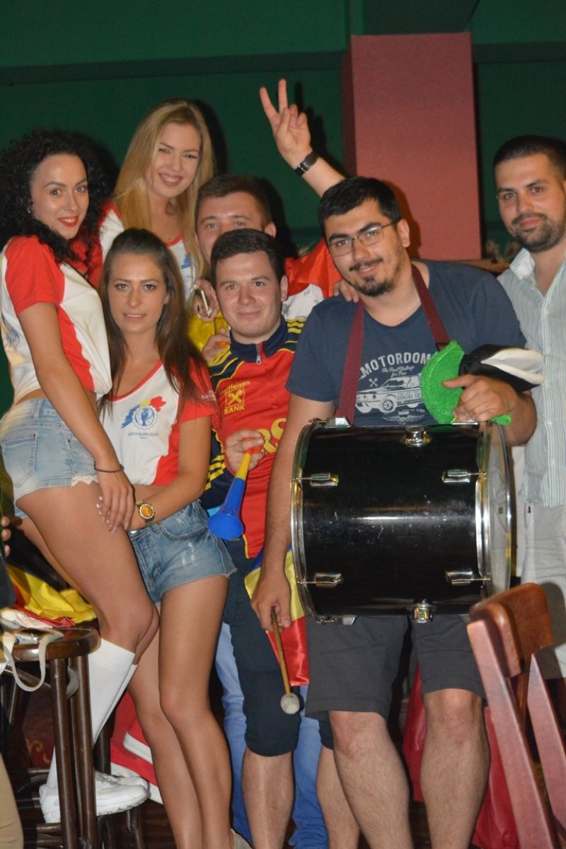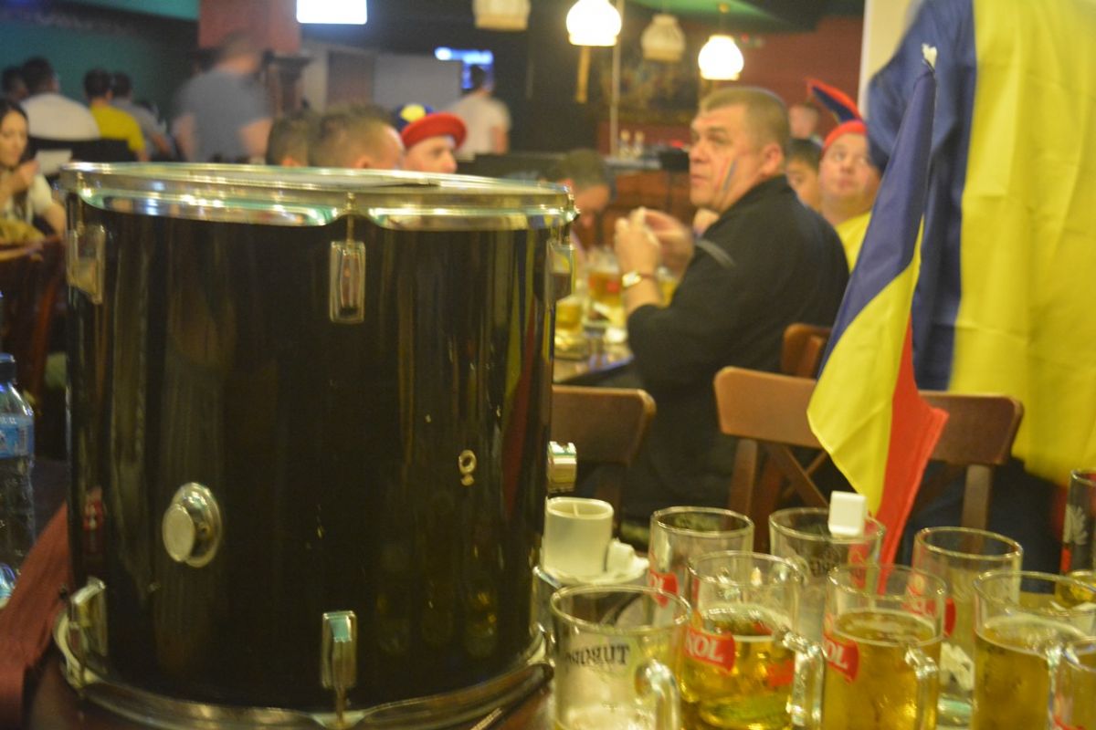 Clubul cu tot cu terasă părea a fi desprins dintr-un sector al ”Stade de France”. Și asta fiindcă microbiștii botoșănenii au venit ca pe stadion. Unii și-au vopsit tricolorul pe față, alții au purtat steagul pe umeri, unii au avut tricouri în roșu, galben și albastru, alții pălării tricolore, unii au suflat în goarne, alții au venit chiar cu o tobă. Aceștia din urmă au dat și tonul la scandări. Și nu s-a strigat doar ”România! România!”, repertoriul fiind cât se poate de variat, de la ”Să-pu-na-ru! Să-pu-na-ru!” la... ”Haideți pe ei, haideți pe ei, haideți pe ei, pe mama lor”.