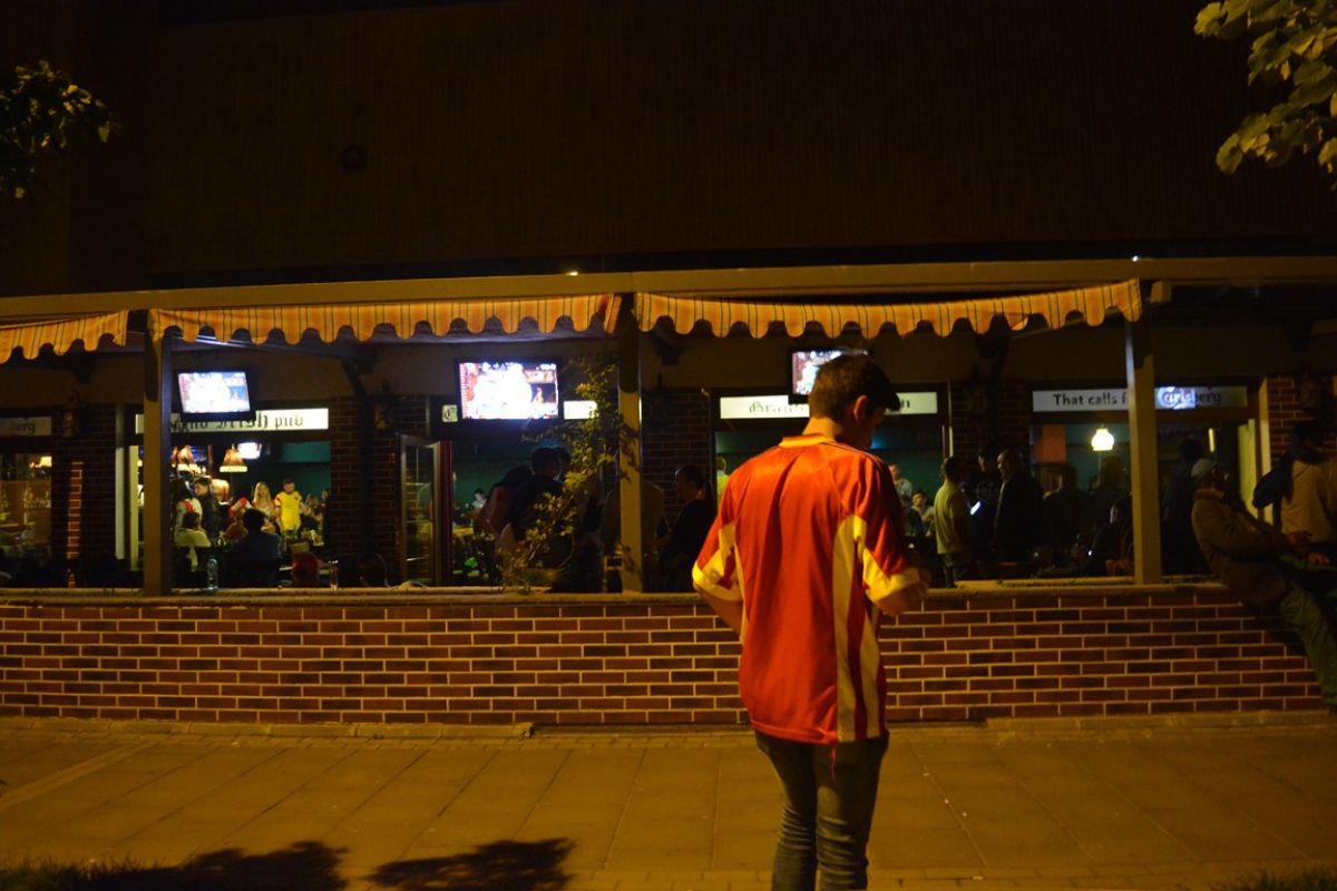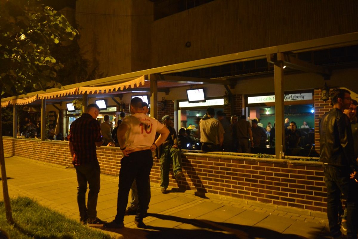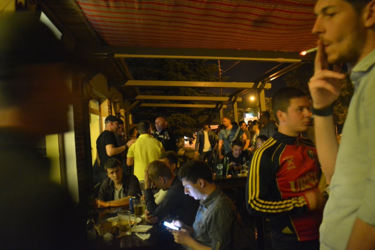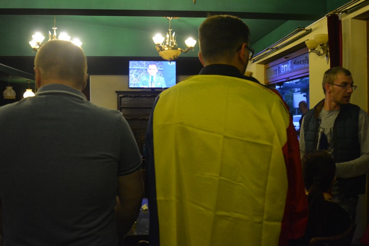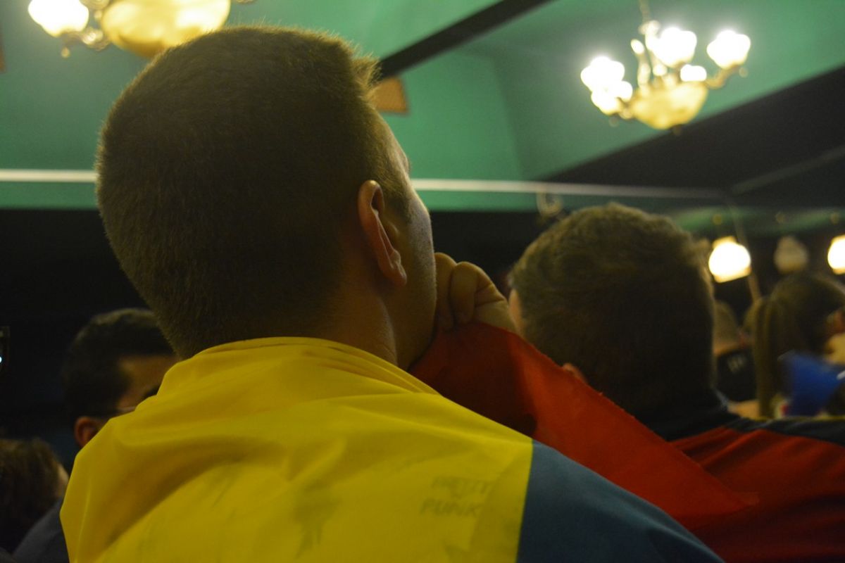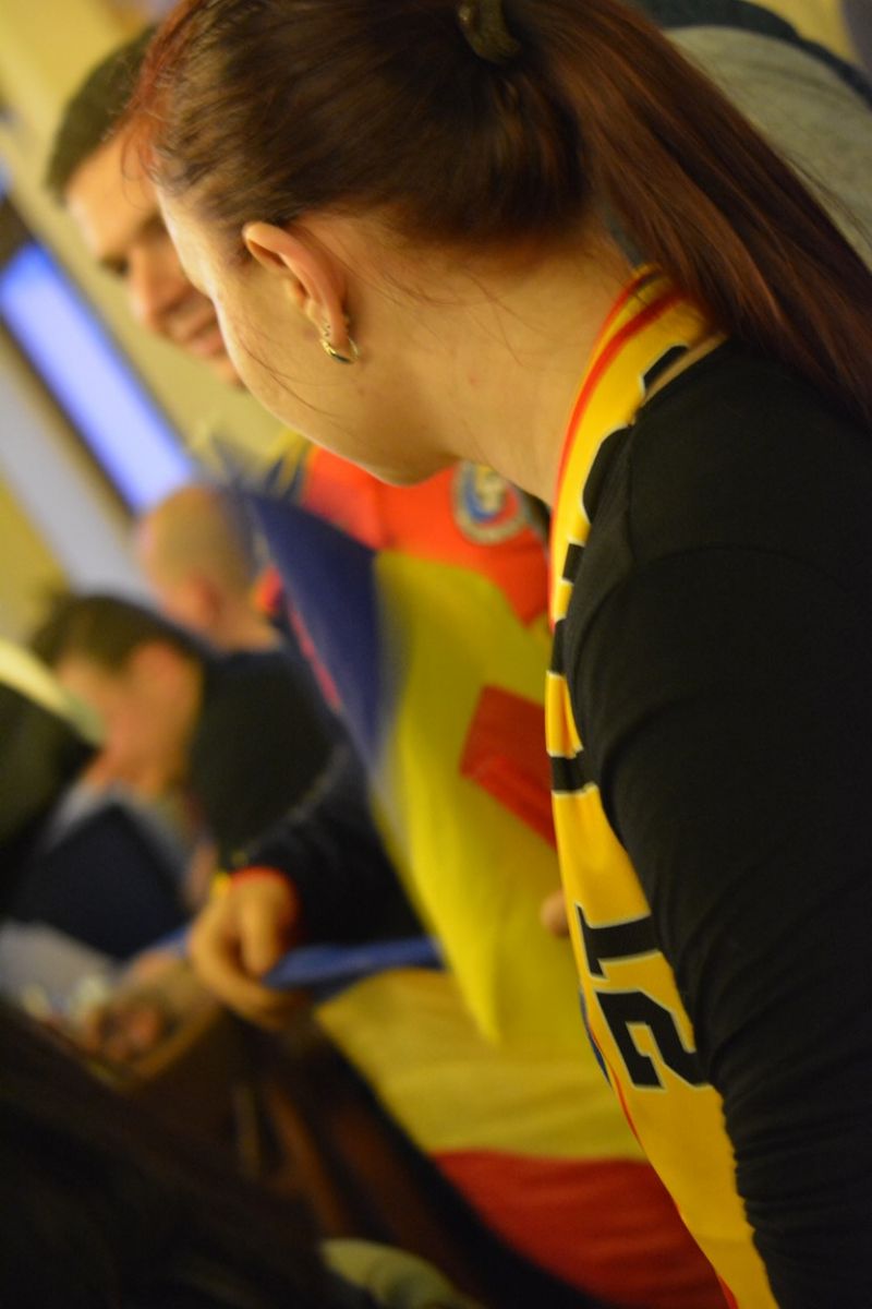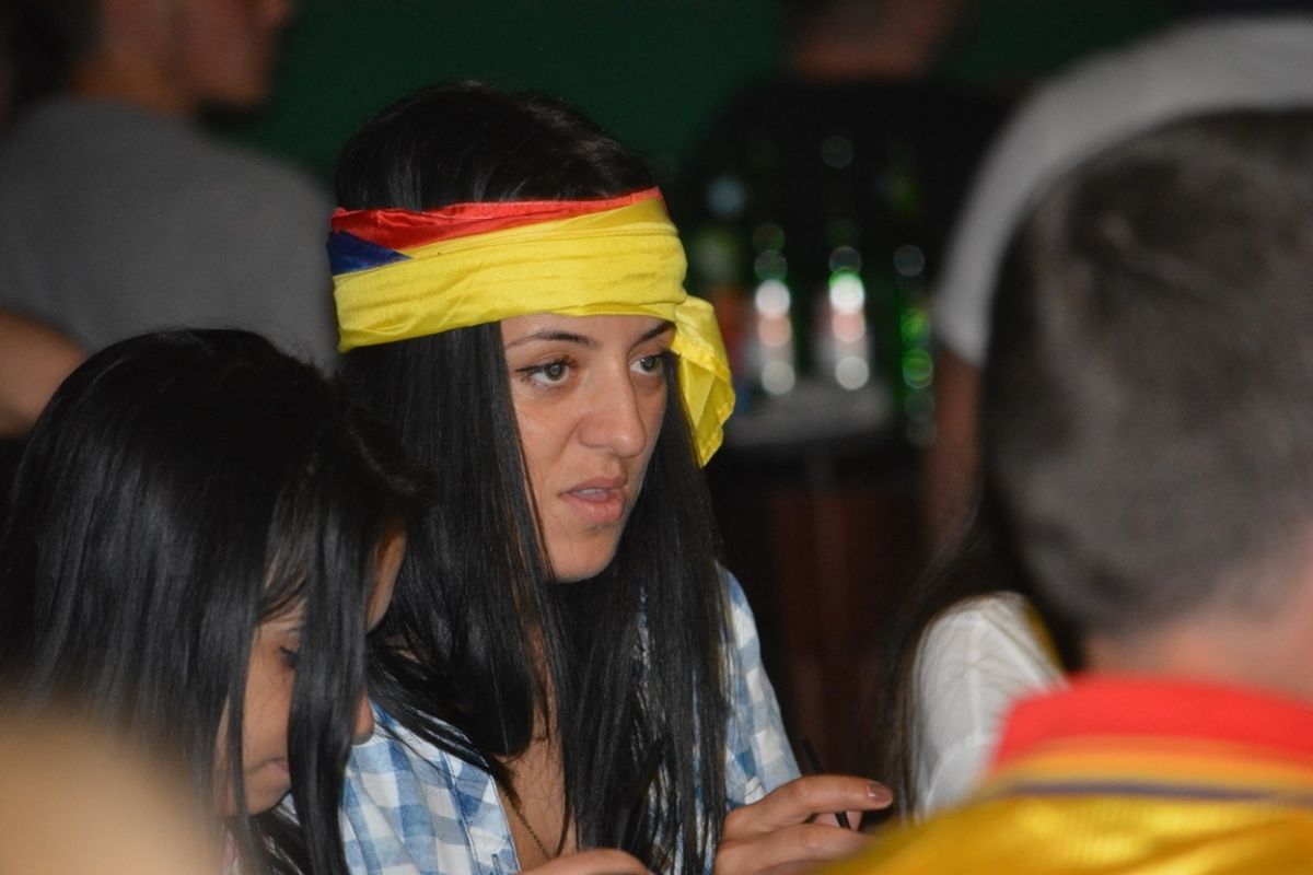 Clubul cu tot cu terasă părea a fi desprins dintr-un sector al ”Stade de France”. Și asta fiindcă microbiștii botoșănenii au venit ca pe stadion. Unii și-au vopsit tricolorul pe față, alții au purtat steagul pe umeri, unii au avut tricouri în roșu, galben și albastru, alții pălării tricolore, unii au suflat în goarne, alții au venit chiar cu o tobă. Aceștia din urmă au dat și tonul la scandări. Și nu s-a strigat doar ”România! România!”, repertoriul fiind cât se poate de variat, de la ”Să-pu-na-ru! Să-pu-na-ru!” la... ”Haideți pe ei, haideți pe ei, haideți pe ei, pe mama lor”.