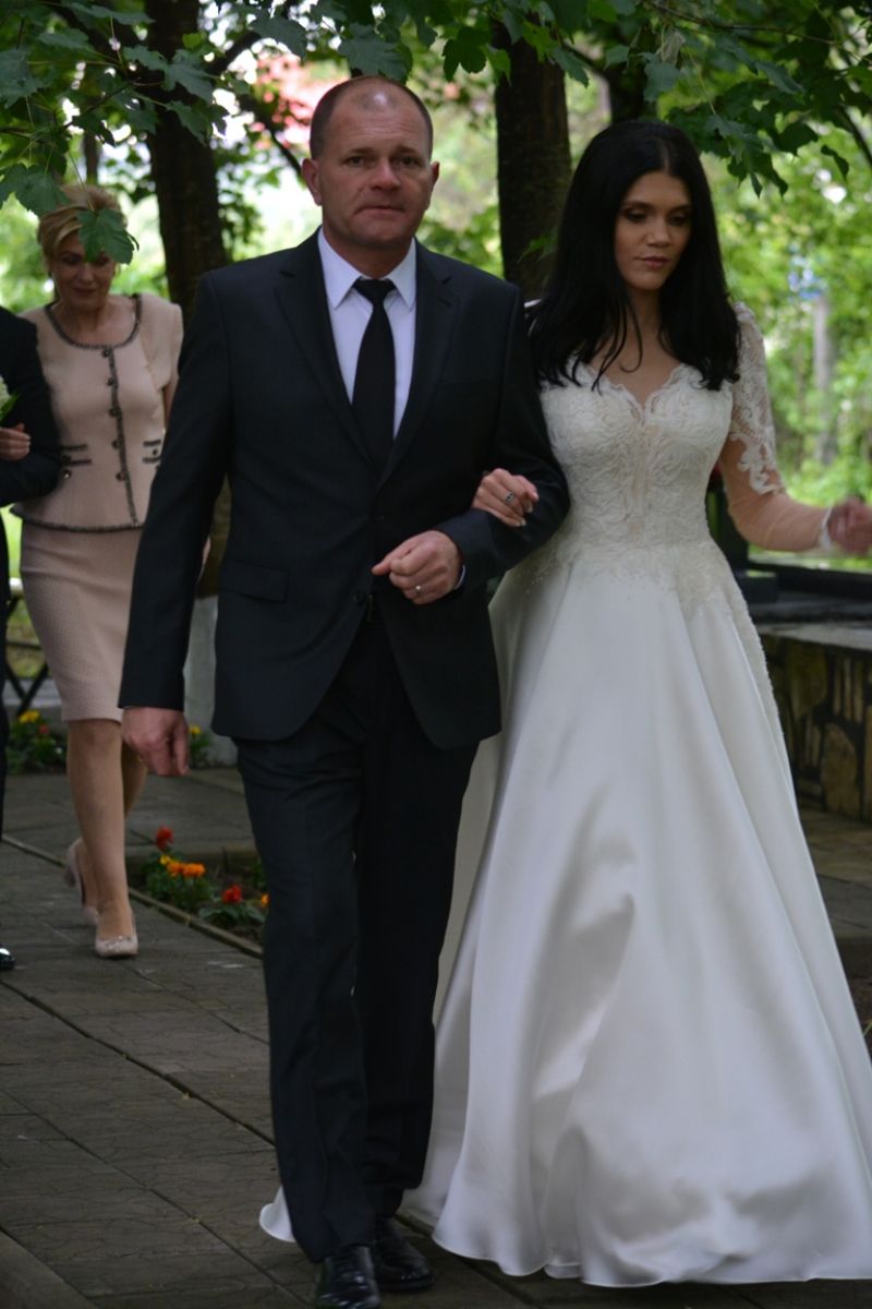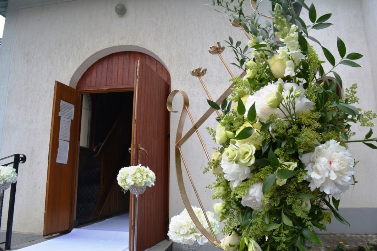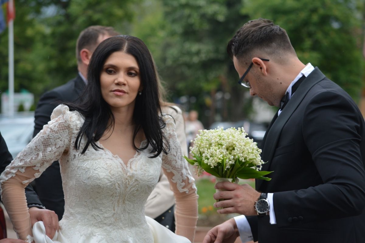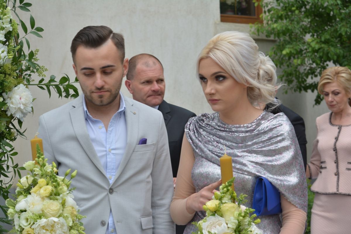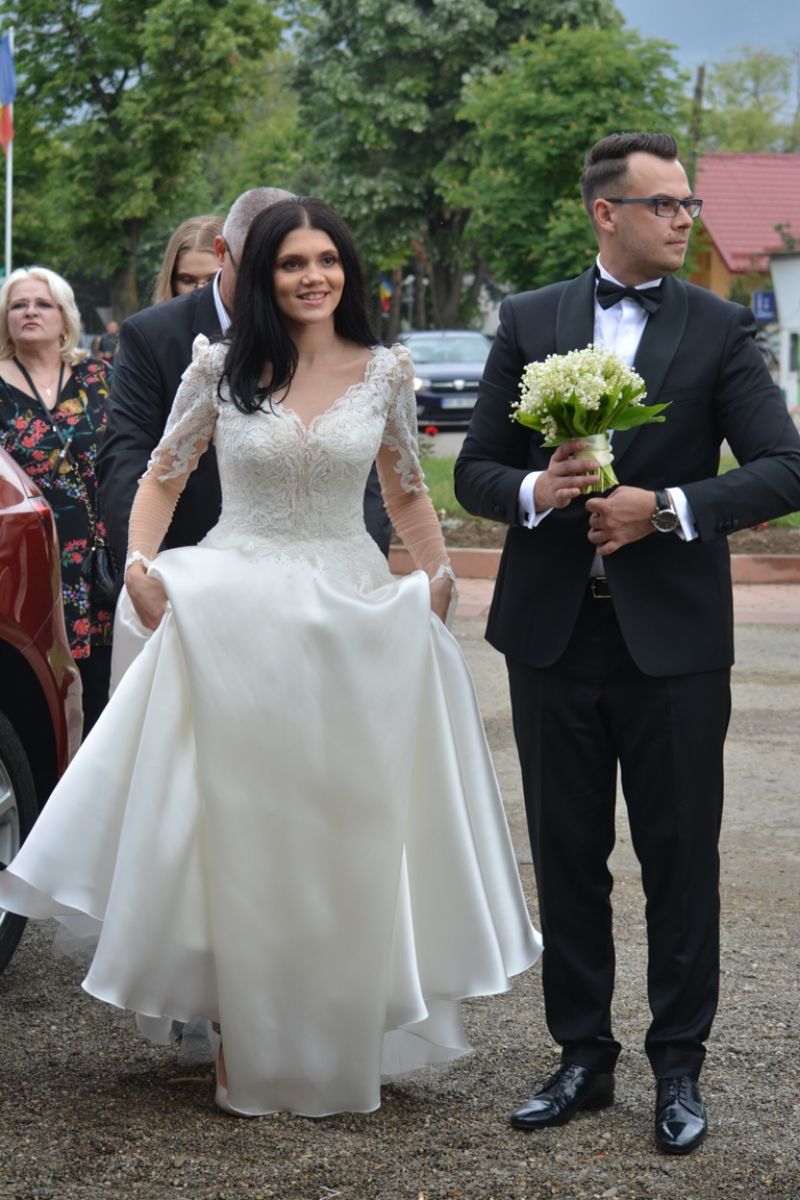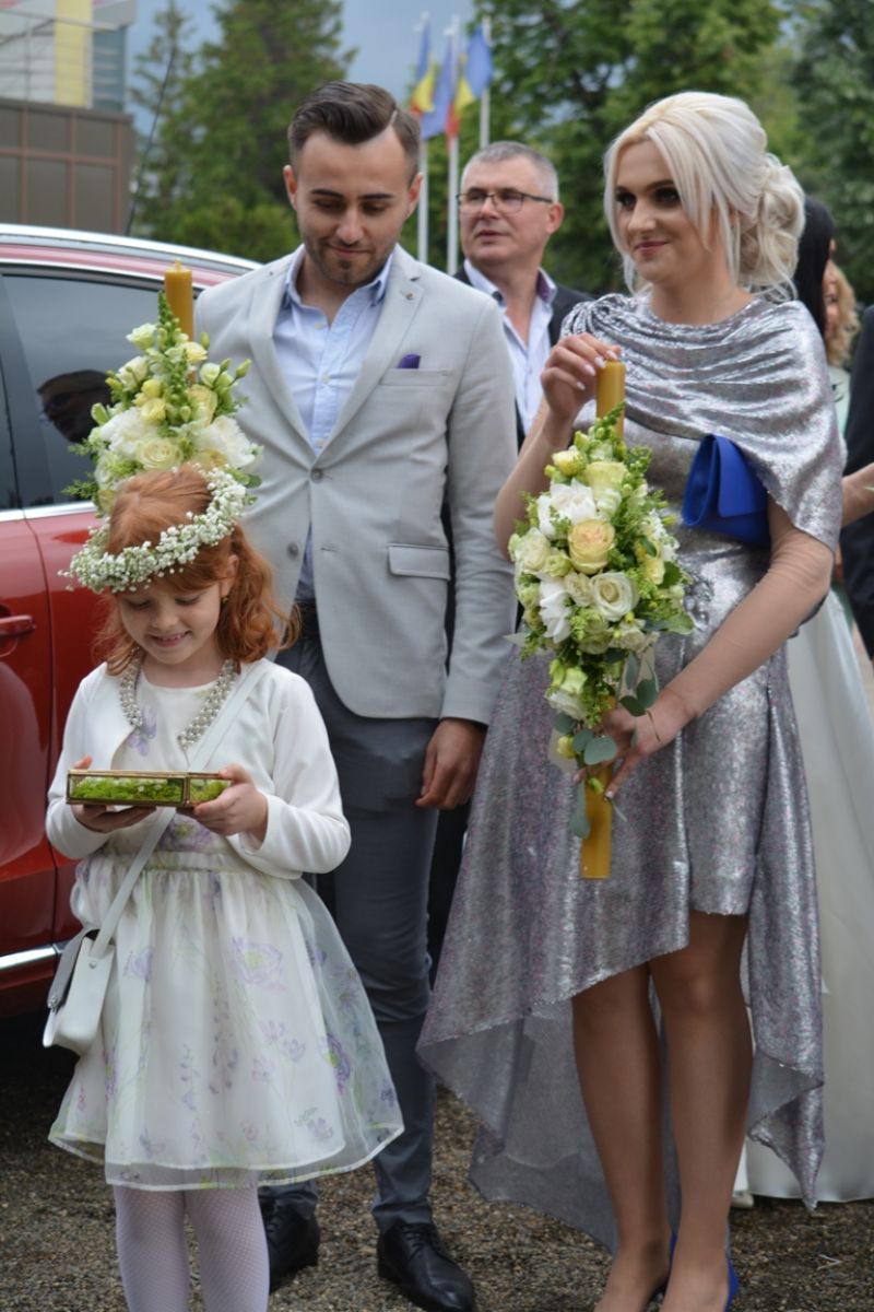 Aceștia au călcat pe mătase albă adusă de florăria ”La Belle Epoque”, care s-a ocupat și de aranjamentul floral pentru sala de petrecere.