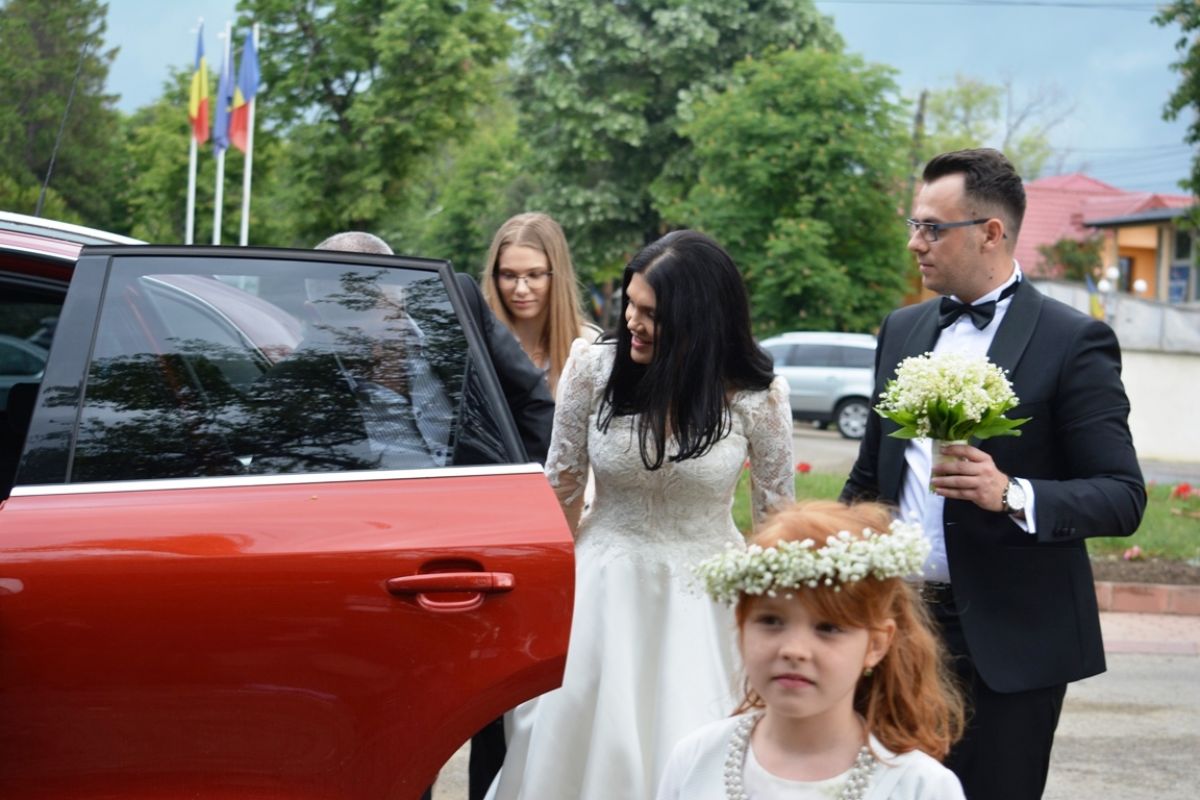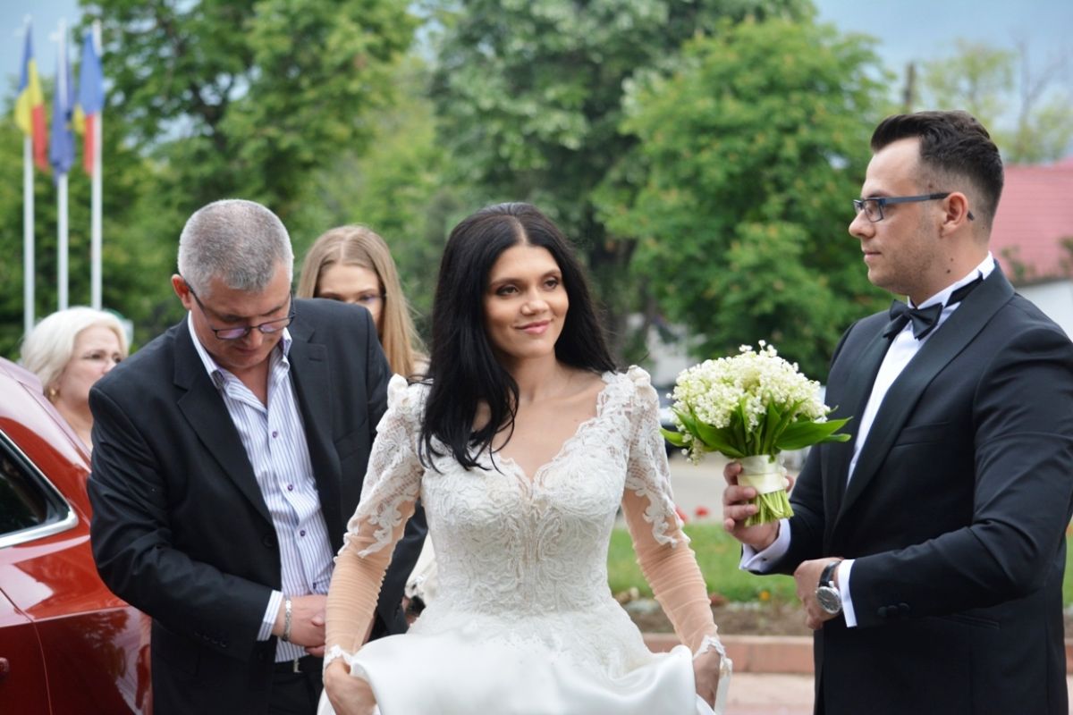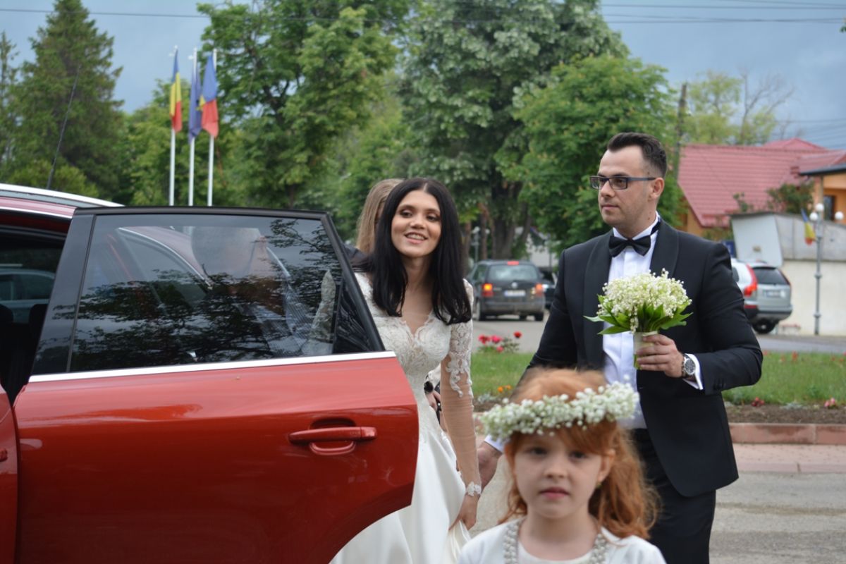 Alex și Katy, așa cum le spun prietenii și colegii, au sosit într-o mașină de teren. Întâi a coborât mirele, care cu un buchet de flori în mâini, a așteptat să coboare și mireasa, deschizându-i portiera.