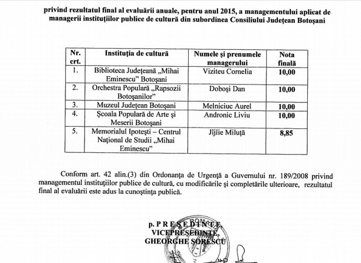 Cinci directori ai instituțiilor de cultură aflați sub tutela Consiliului Județean Botoșani au trecut prin obișnuitul proces de evaluare efectuat anual, din punct de vedere al îndeplinirii indicatorilor pe linie de management.