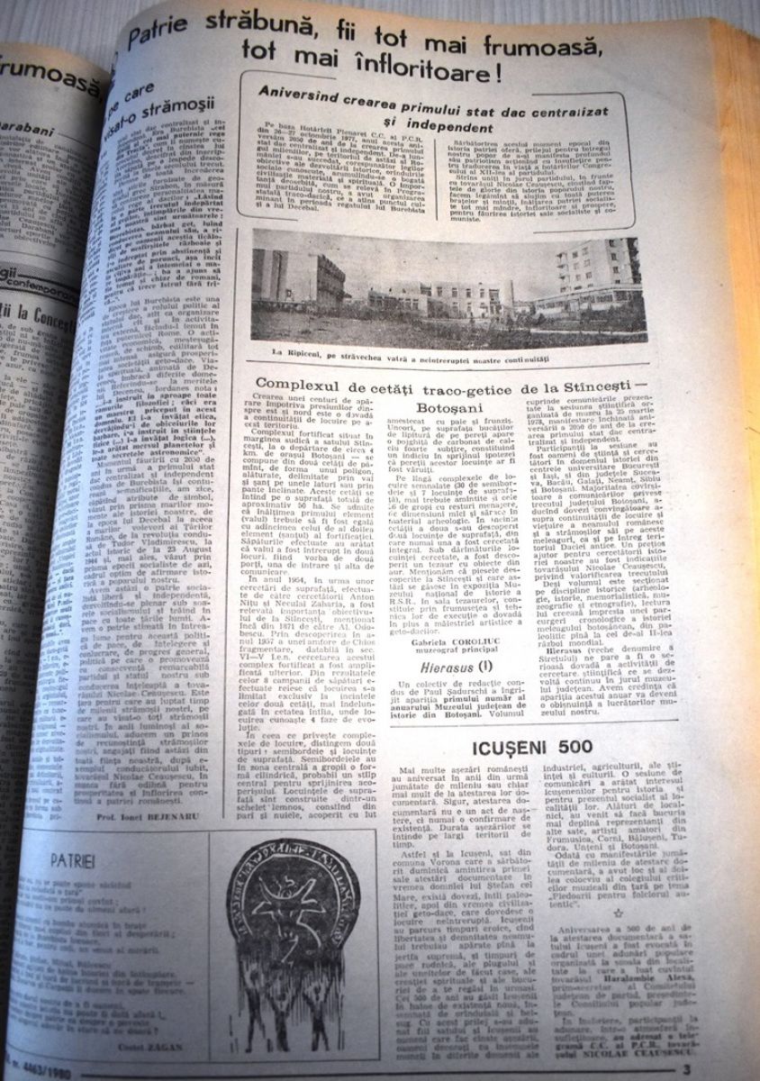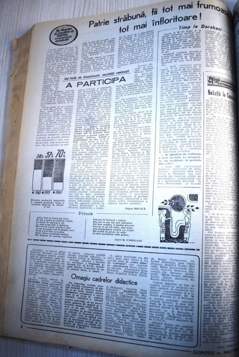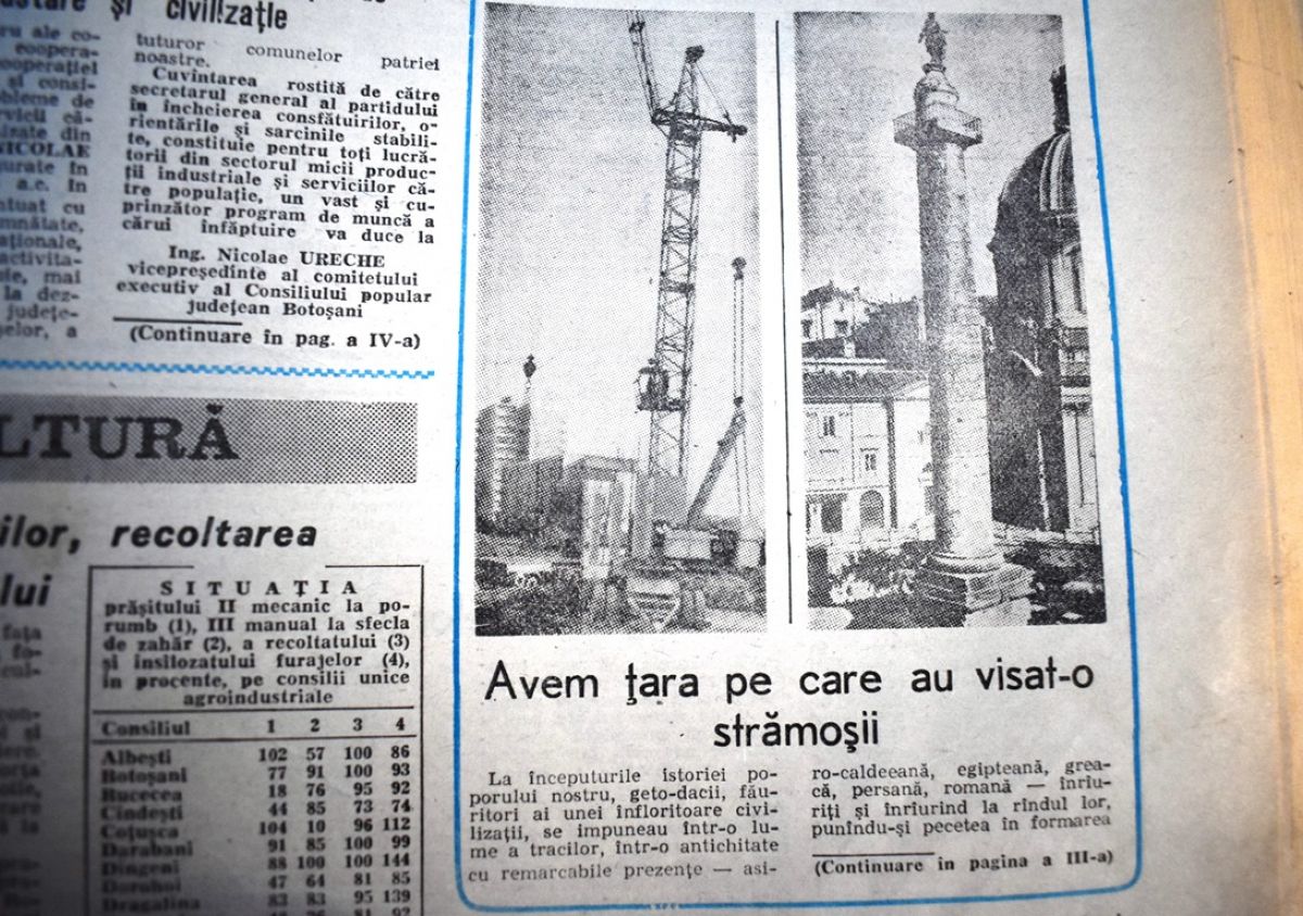 Botoșănenii care poate că au dat atunci 50 de bani pe ziar în speranța că vor afla informații despre autobuzul căzut în mlaștină, s-au ”delectat” însă pe prima pagină cu articole din aceeași gamă: ”Întreținerea culturilor, furajelor, pregătirea secerișului”, ”Situația prășitului (...) și însilozatului furajelor” și ”Avem țara pe care au visat-o strămoșii”. Ultimul titlu făcea parte din seria ”2050 – Aniversarea creării primului stat dac centralizat și independent”, o invenție a istoricilor comuniști demontată după revoluție.