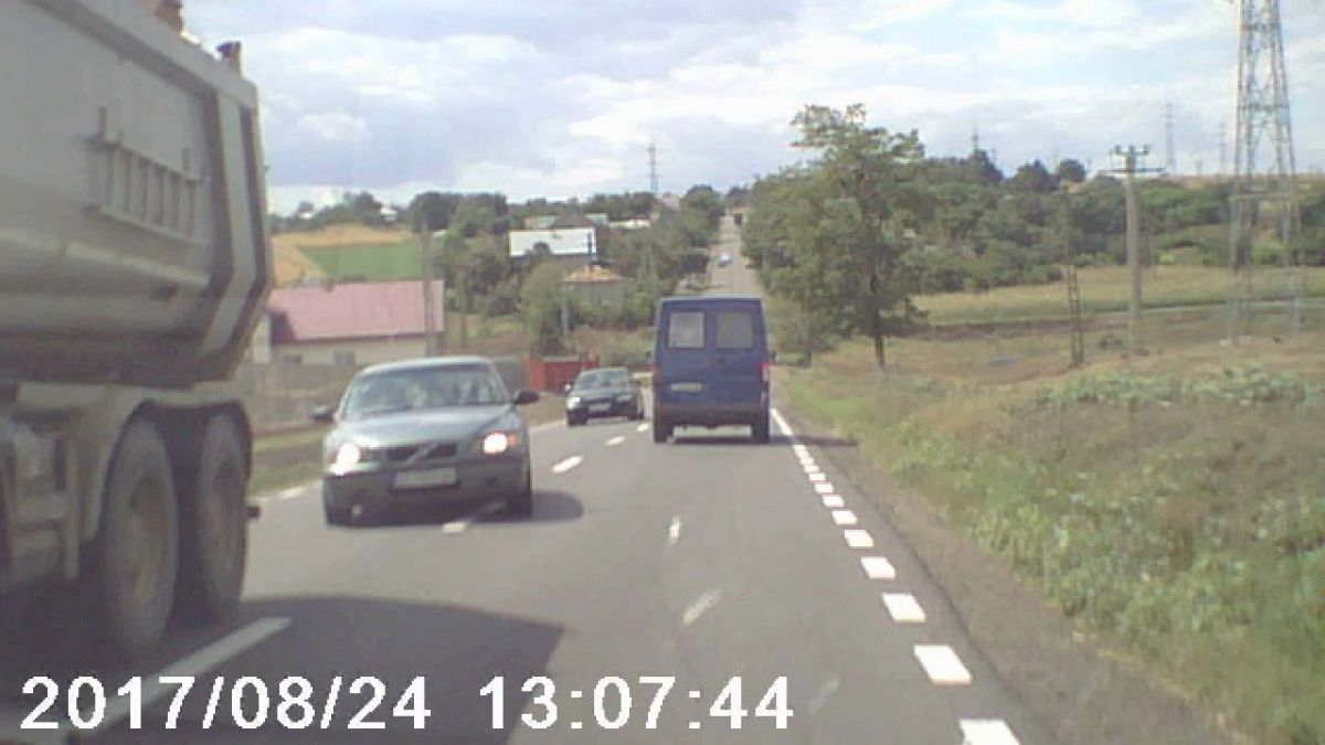 Din filmare se vede cum un Volvo ce vine din sens opus încearcă să iasă din coloană și să se angajeze în depășire. Șoferul trage de volan în ultima secundă.