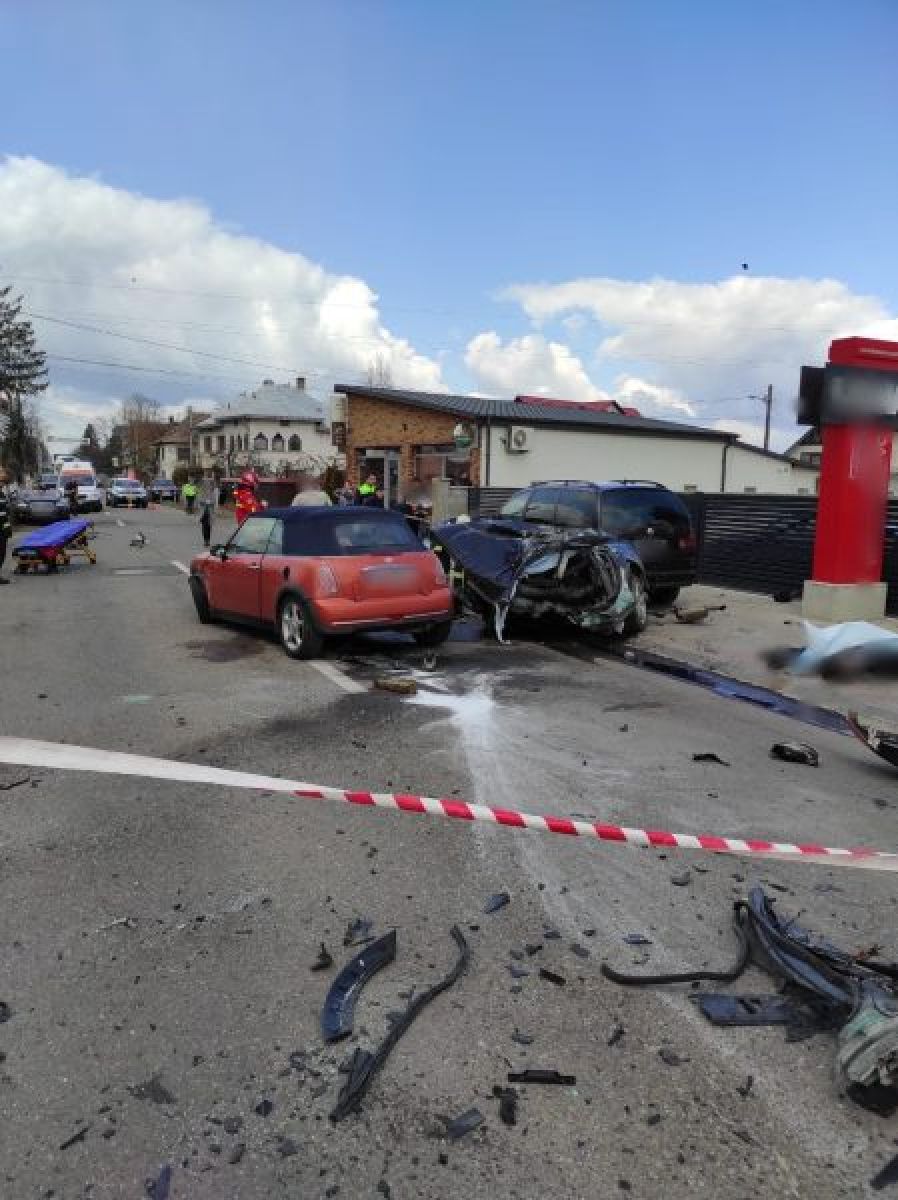 Autoturismul Audi care a intrat în depășirea coloanei, pentru a evita coliziunea cu autoturismul MiniCooper a virat stânga, intrând în coliziune violenta cu un stâlp de energie electrică.