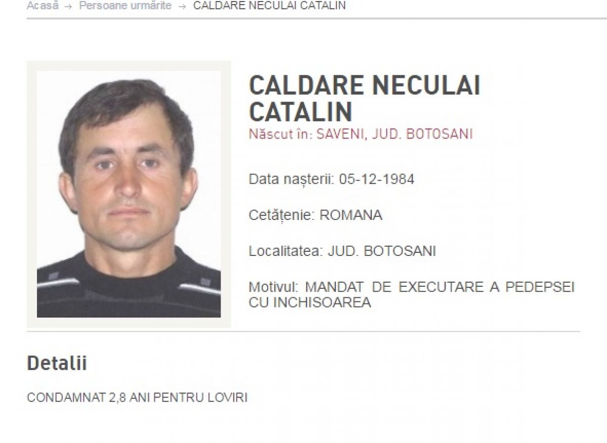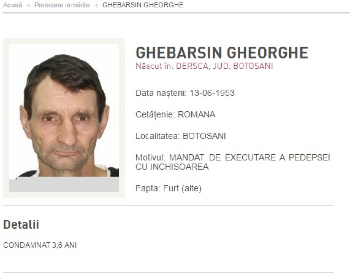 Ultimul, Gheorghe Ghebarsin, născut în comuna Dersca, județul Botoșani, este dat în urmărire pentru săvârșirea infracțiunii de furt. Bărbatul are de executat o pedeapsă de trei ani și șase luni de închisoare.