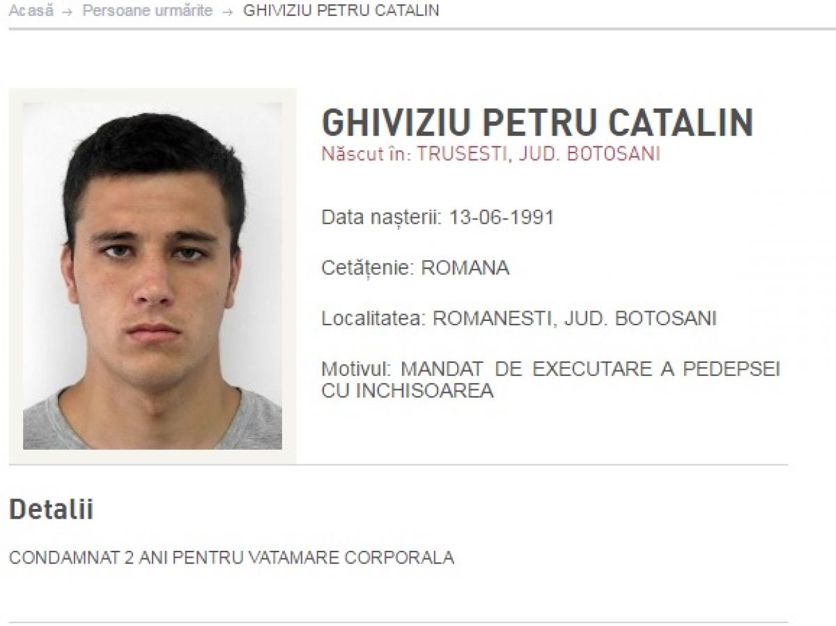 Este vorba despre Cătălin Ghiviziu, în vârstă de 24 de ani, născut în comuna Trușești, județul Botoșani. Oamenii legii îl caută pe tânăr pentru că pe numele acestuia a fost emis un mandat de executare a pedepsei de doi ani de închisoare pentru comiterea infracțiunii de vătămare corporală.