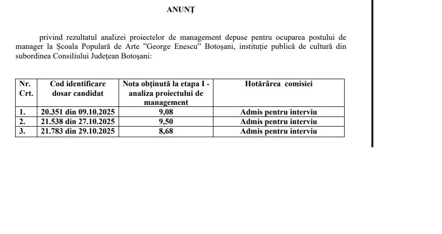 Vineri, 14 noiembrie 2025, au fost afișate rezultatele analizei proiectelor de manager depuse de către cei trei candidați intrați în cursă.