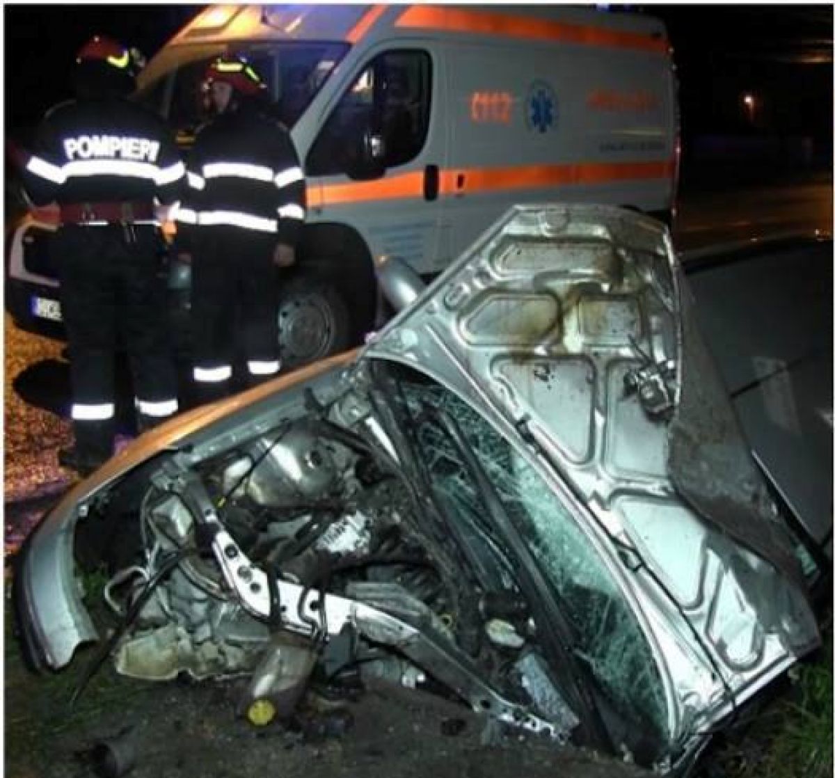 Şoferul a pierdut controlul volanului într-o depăşire, şoseaua era umedă şi autoturismul a derapat. Maşina s-a izbit puternic de un cap de pod. Rând pe rând, cei trei tineri au ieşit singuri, povestesc martorii.