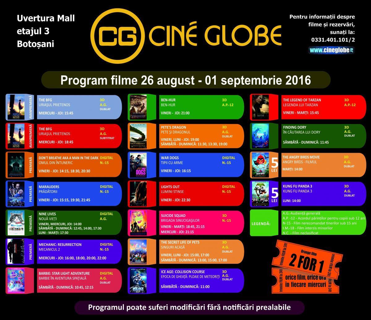 O avanpremieră și patru premiere vor rula pe marile ecrane ale multiplexului din incinta Uvertura Mall în perioada 26 august -1 septembrie 2016.
