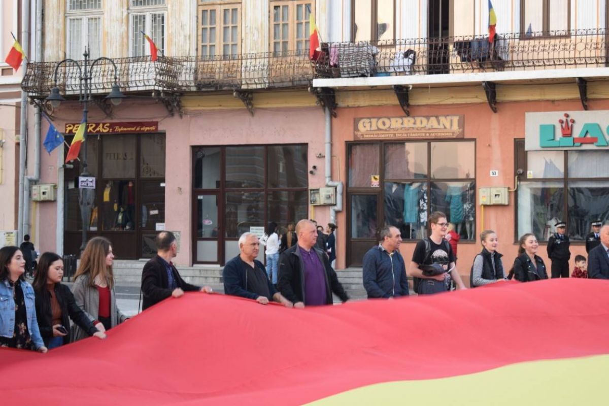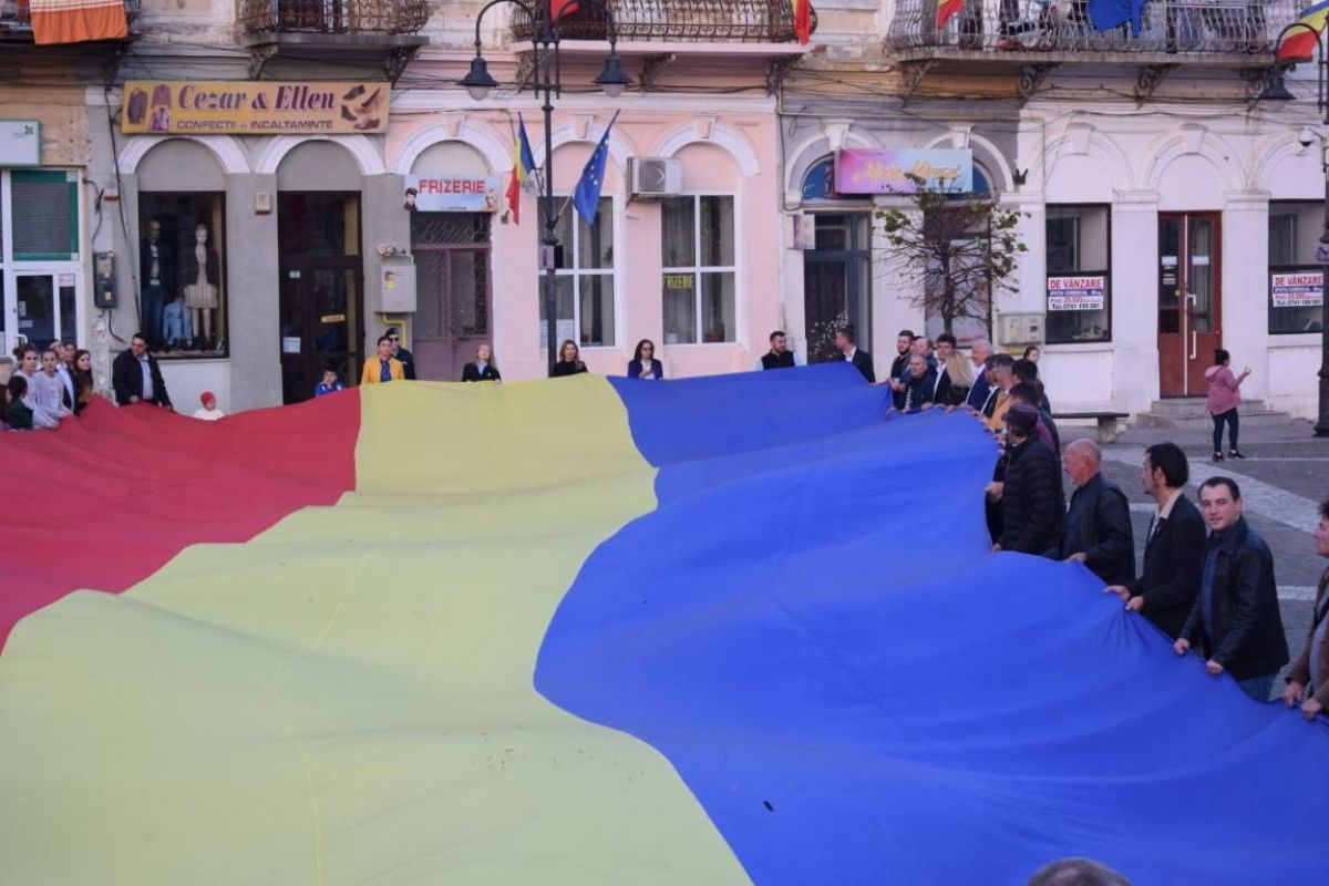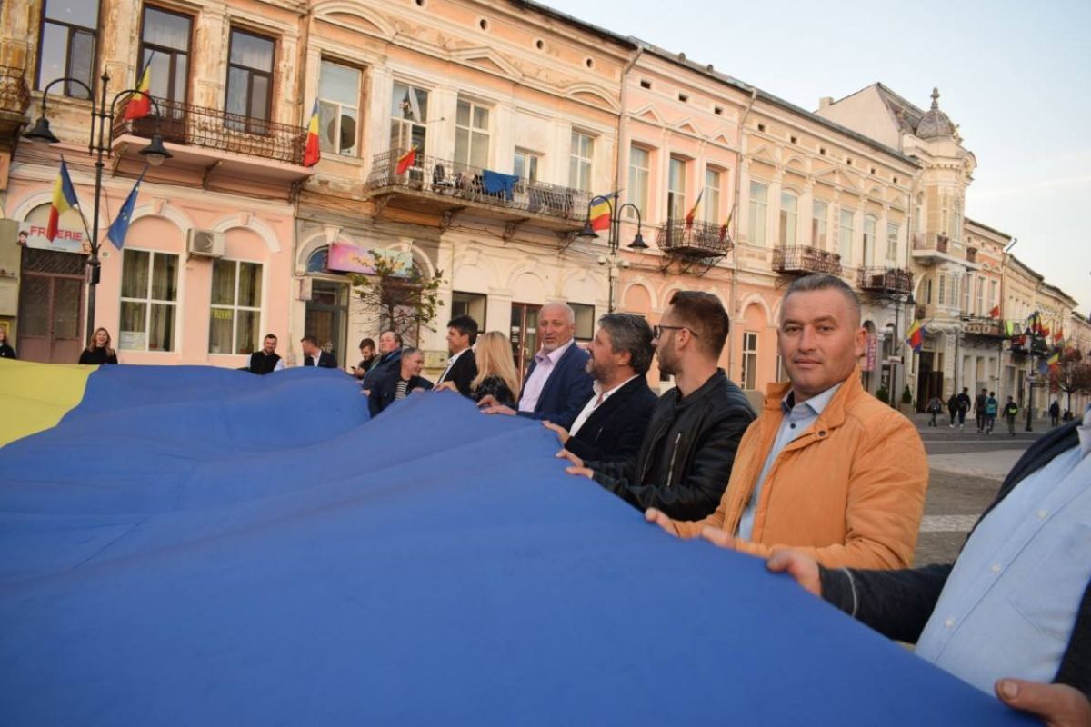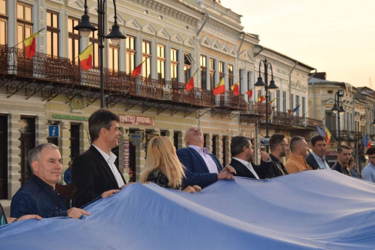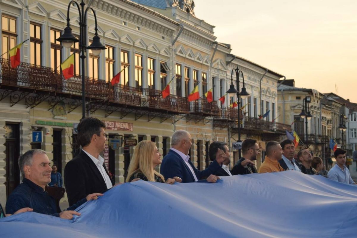 Un steag uriaș de circa 30 de metri lungime și 10 metri lățime a ajuns la sediul liberalilor din strada Teatrului. A fost purtat într-un marș până la Muzeul Județean de pe Pietonalul Unirii, unde a fost desfășurat și ţinut pe brațe de zeci de tineri și seniori de la PNL.