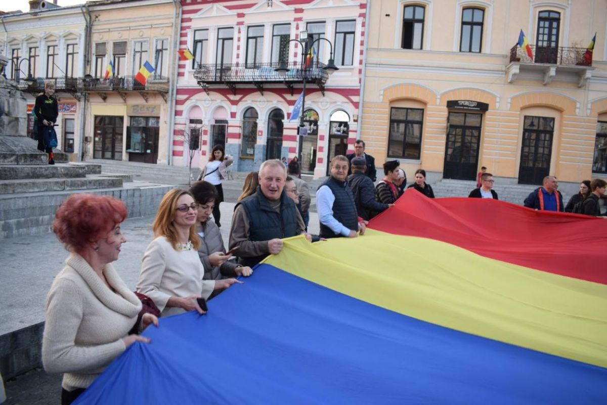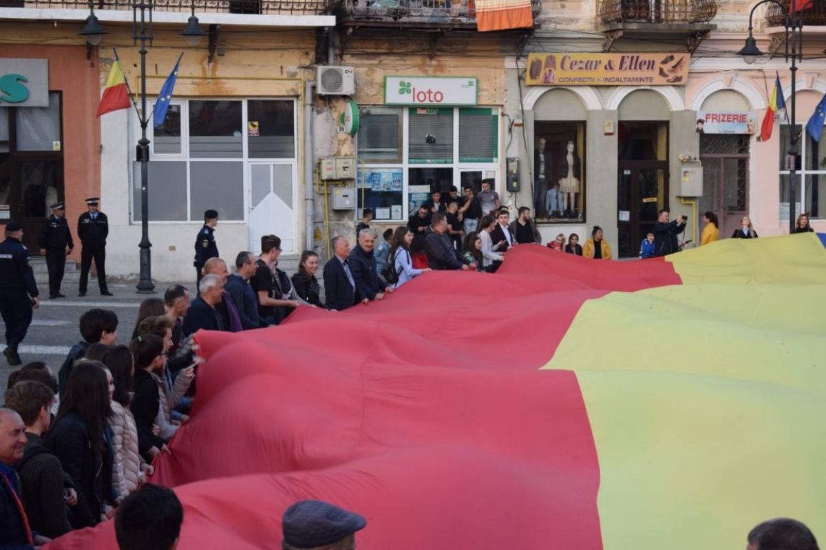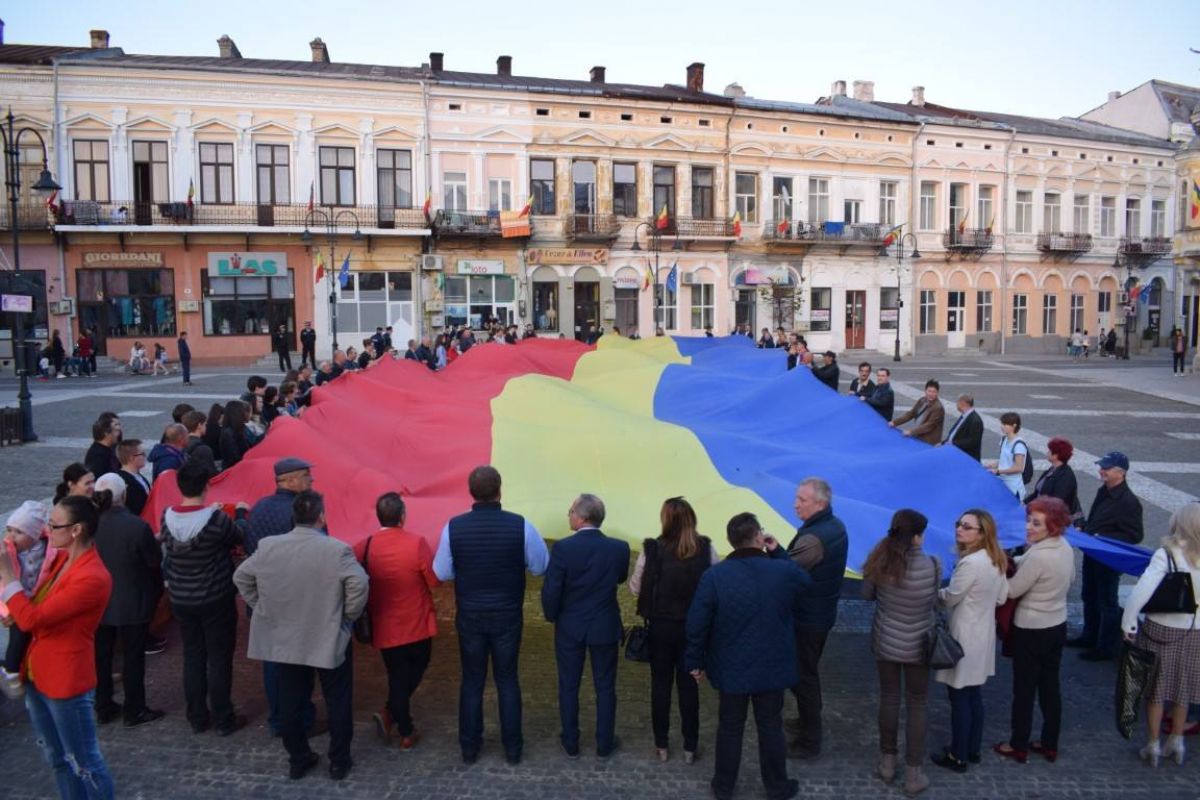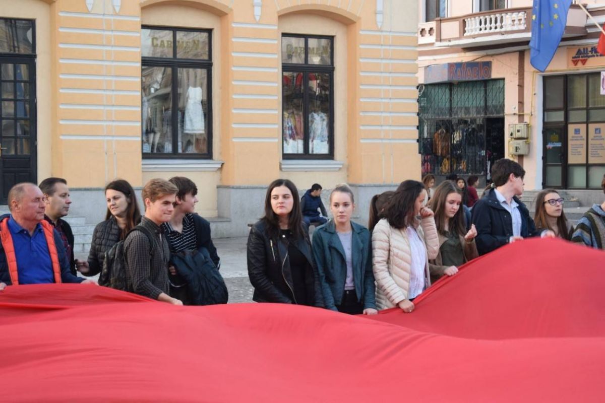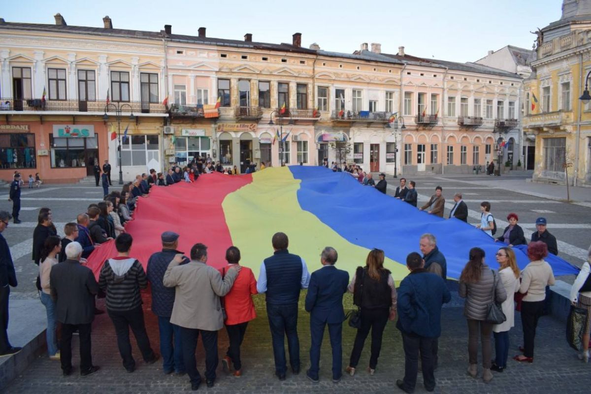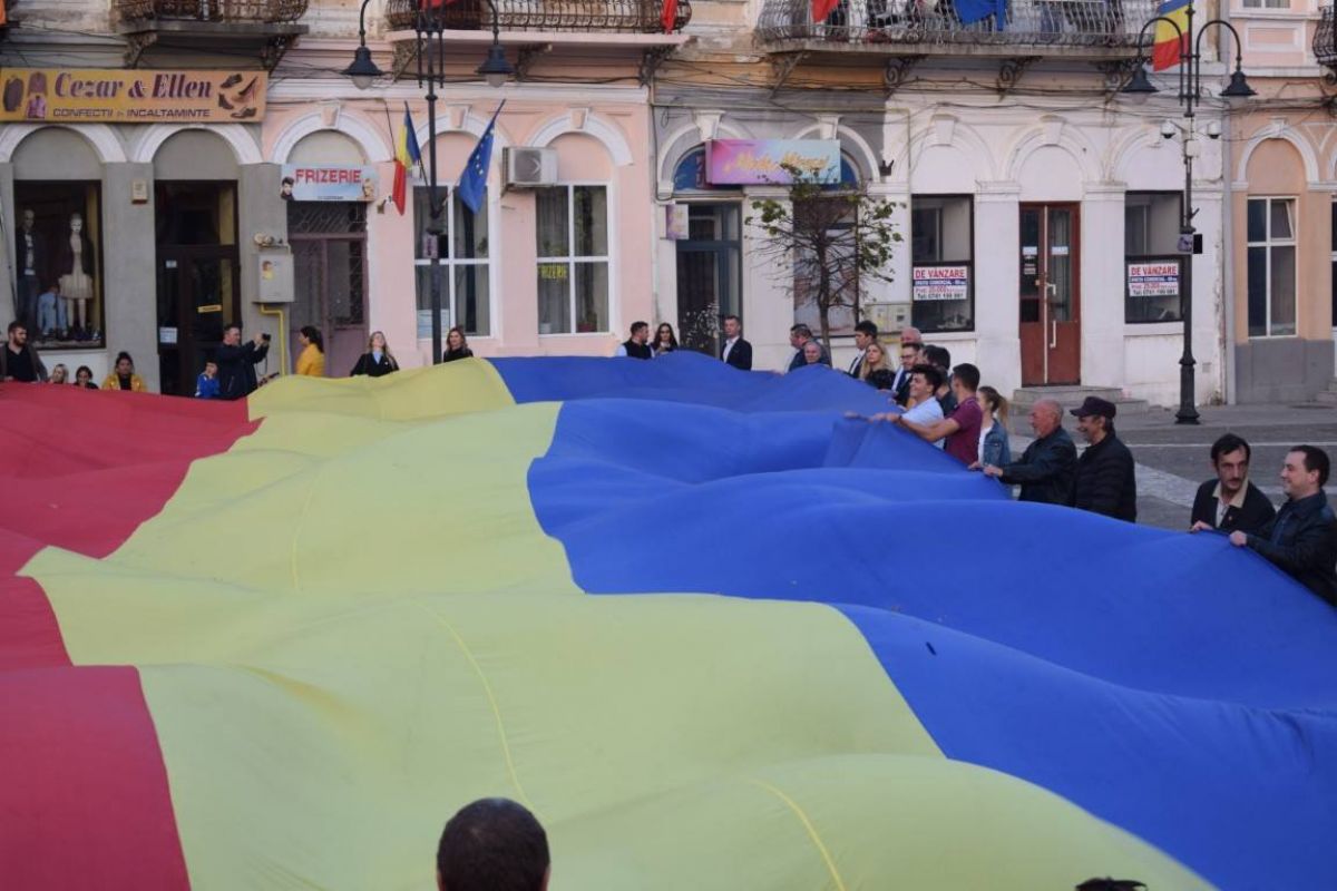 Un steag uriaș de circa 30 de metri lungime și 10 metri lățime a ajuns la sediul liberalilor din strada Teatrului. A fost purtat într-un marș până la Muzeul Județean de pe Pietonalul Unirii, unde a fost desfășurat și ţinut pe brațe de zeci de tineri și seniori de la PNL.