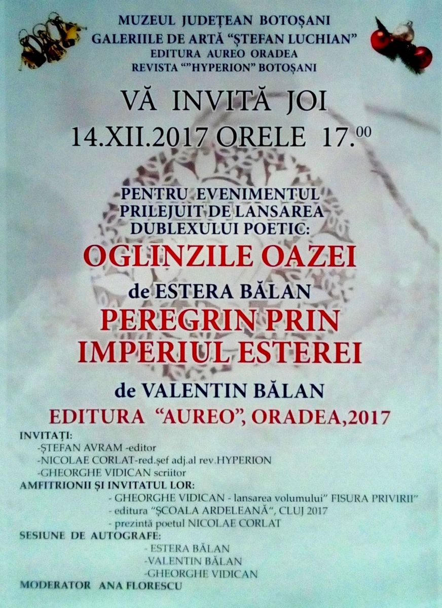 Lansarea de carte vizează: ,,Oglinzile oazei”- autor Estera Bălan, ,,Peregrin prin imperiul Esterei”, semnat Valentin Bălan – Editura ,,AUREO”, Oradea, 2017 și ,,Fisura privirii”- volum al cunoscutului scriitor Gheorghe Vidican - Editura ,,Școala Românească”, Cluj, 2017.