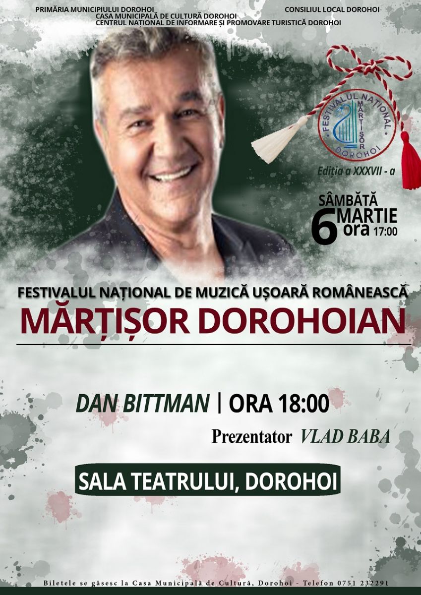 Primăria Municipiului Dorohoi și Consiliul Local prin Casa Municipală de Cultură Dorohoi și Centrul Național de Informare și Promovare Turistică organizează în data de 6 martie 2021, la Sala Teatrului Dorohoi, cea de-a XXXVII-a ediție a Festivalului – Concurs Național de Muzică Ușoară „Mărțișor Dorohoian”.