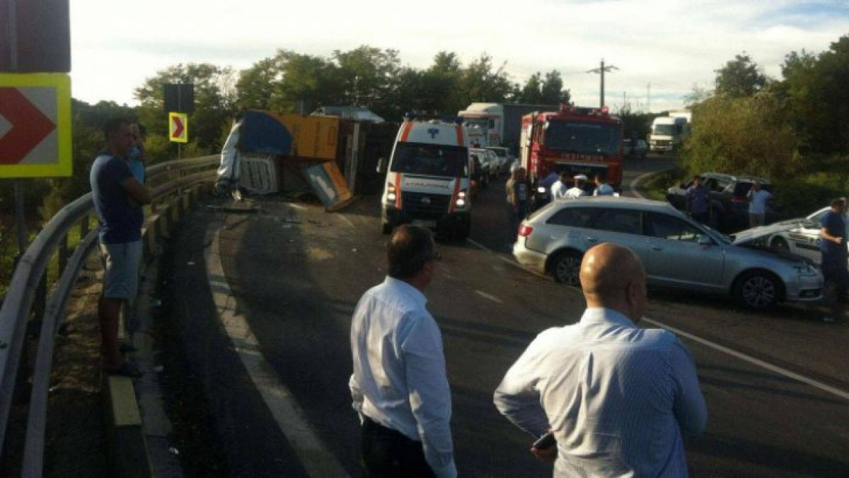 „La km 160+400m autotir înmatriculat Bihor care circula pe direcţia Pitesti-Rm. Vâlcea, pe fondul neadaptarii vitezei la condiţiile de drum, curbă deosebit de periculoasă la dreapta, s-a răsturnat pe sensul opus de mers acroşând două autoturisme care circulau pe direcţia Rm. Vâlcea-Piteşti! În urma impactului au rezultat 4 victime din care 3 rănite grav. Şoferul tirului este un bărbat de 56 de ani şi este rănit grav”, a declarat Popescu.