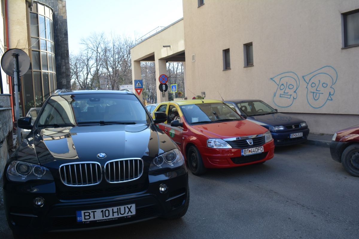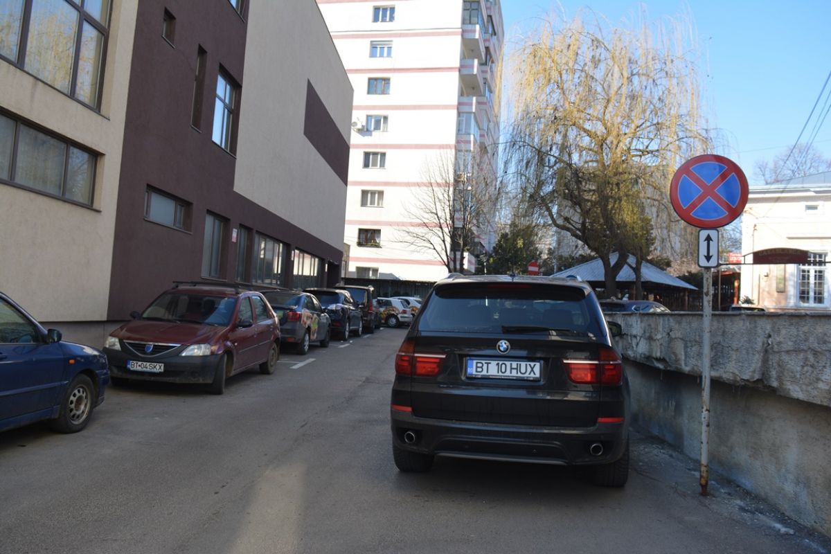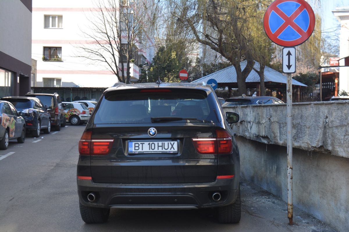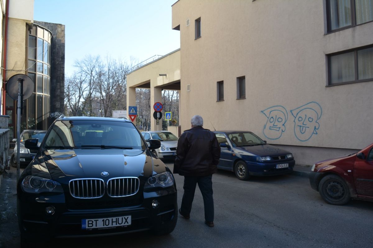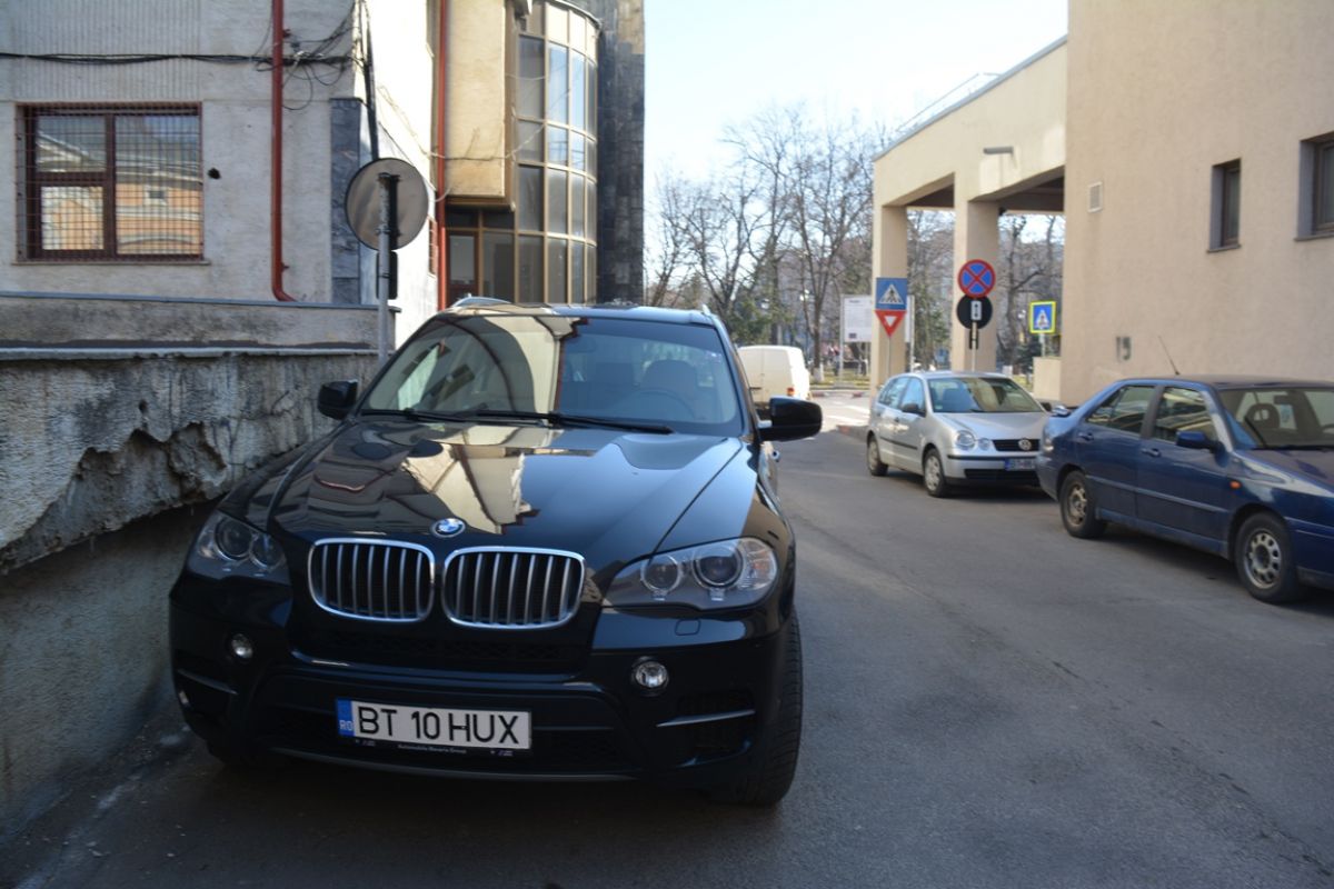 Timp de zeci de minute, automobilul BMW X5 pe care președintele Consiliului Județean Botoșani îl deține a staționat pe aleea dintre Hotelul Rapsodia și fostul sediu al Gărzii Financiare, chiar sub semnul cu ”oprirea interzisă”.