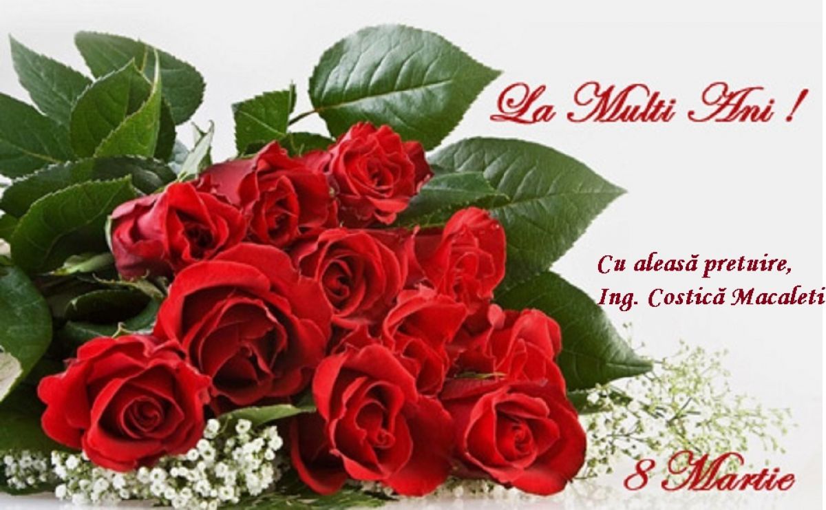 Primavara, anotimpul renasterii, al trezirii la viata a naturii, face din aceasta speciala zi de 8 Martie ziua cea mai plina de feminitate, zambete si caldura sufleteasca. 8 Martie este ziua in care se imbina armonios caracteristicile principale ale femeilor: sensibilitatea, frumusetea, tandretea si finetea. Fie ca este vorba de mame, sotii, fiice,colege de serviciu doresc sa transmit cu ocazia acestei zile speciale un gand bun, o primavara plina de bucurii, de speranta si credinta ca mergem spre mai bine. Va doresc sa aveti parte de o primavara plina de armonie si pace sufleteasca, aducandu-va simbolic in dar un martisor, care, prin spiritul sau de primavara, sa zaboveasca cat mai mult in sufletul Dumneavoastra. La multi ani!