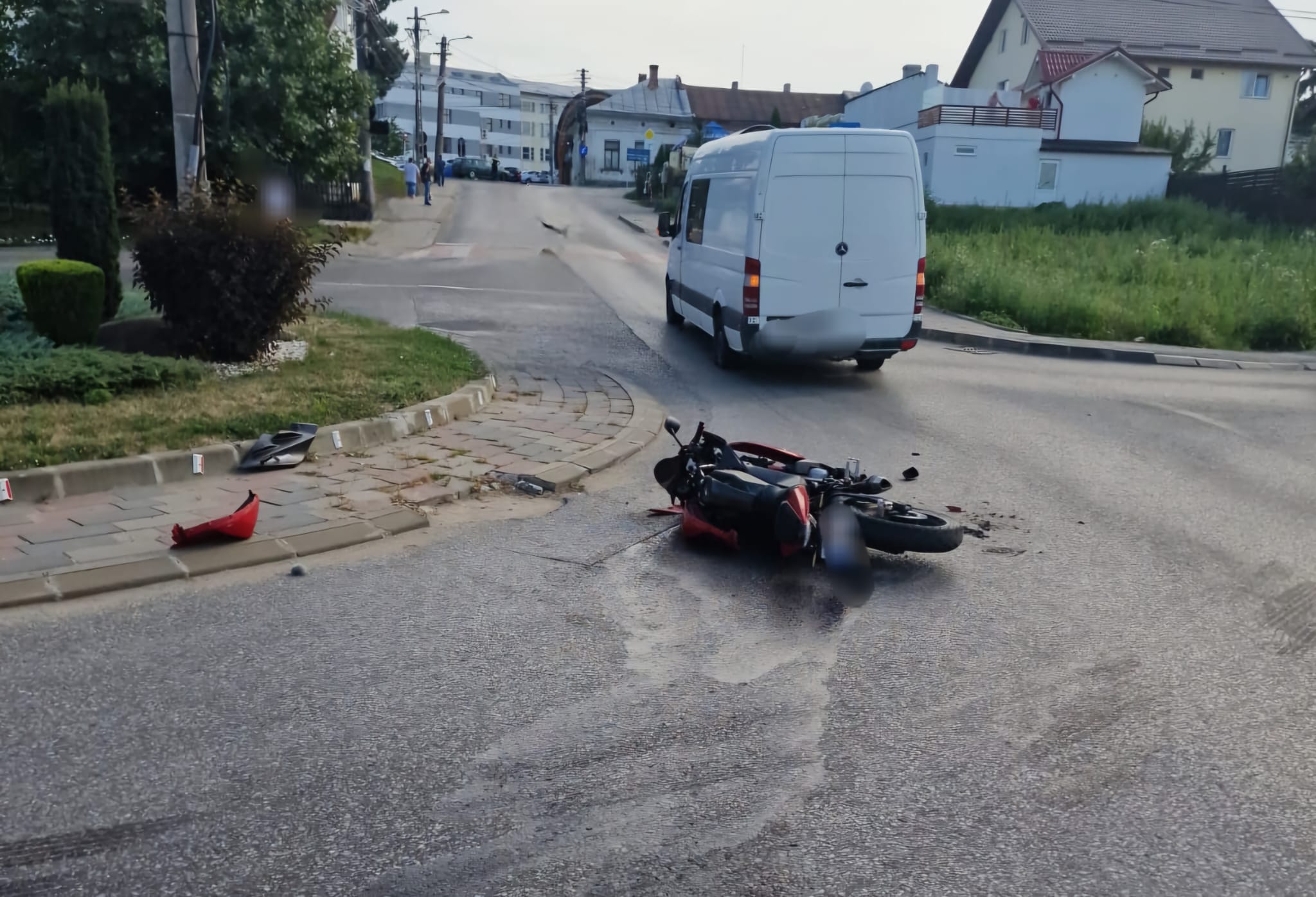 În eveniment au fost implicate o autoutilitară și o motocicletă. S-a întâmplat în urmă cu puțin timp.