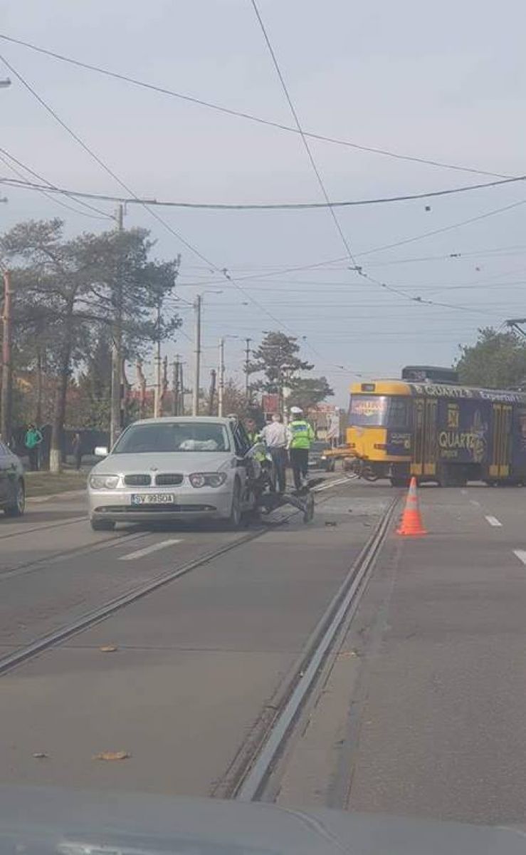 De data aceasta nu au fost implicate două autoturisme, ci un tramvai și o mașină marca BMW.
