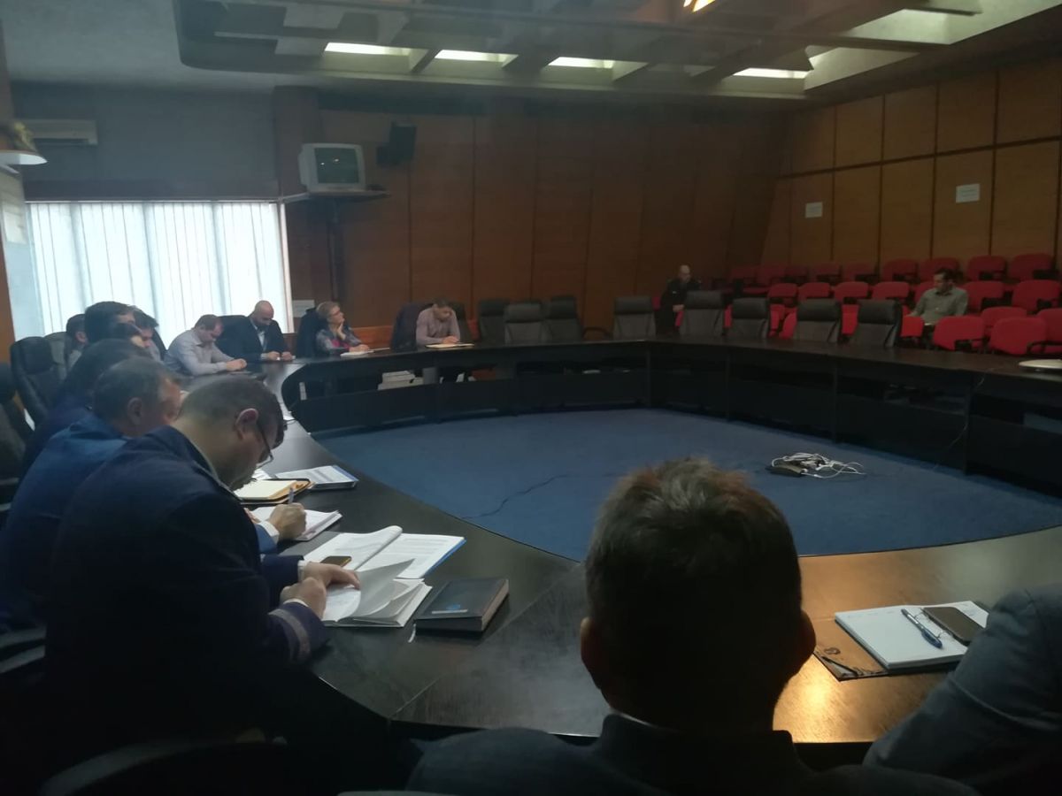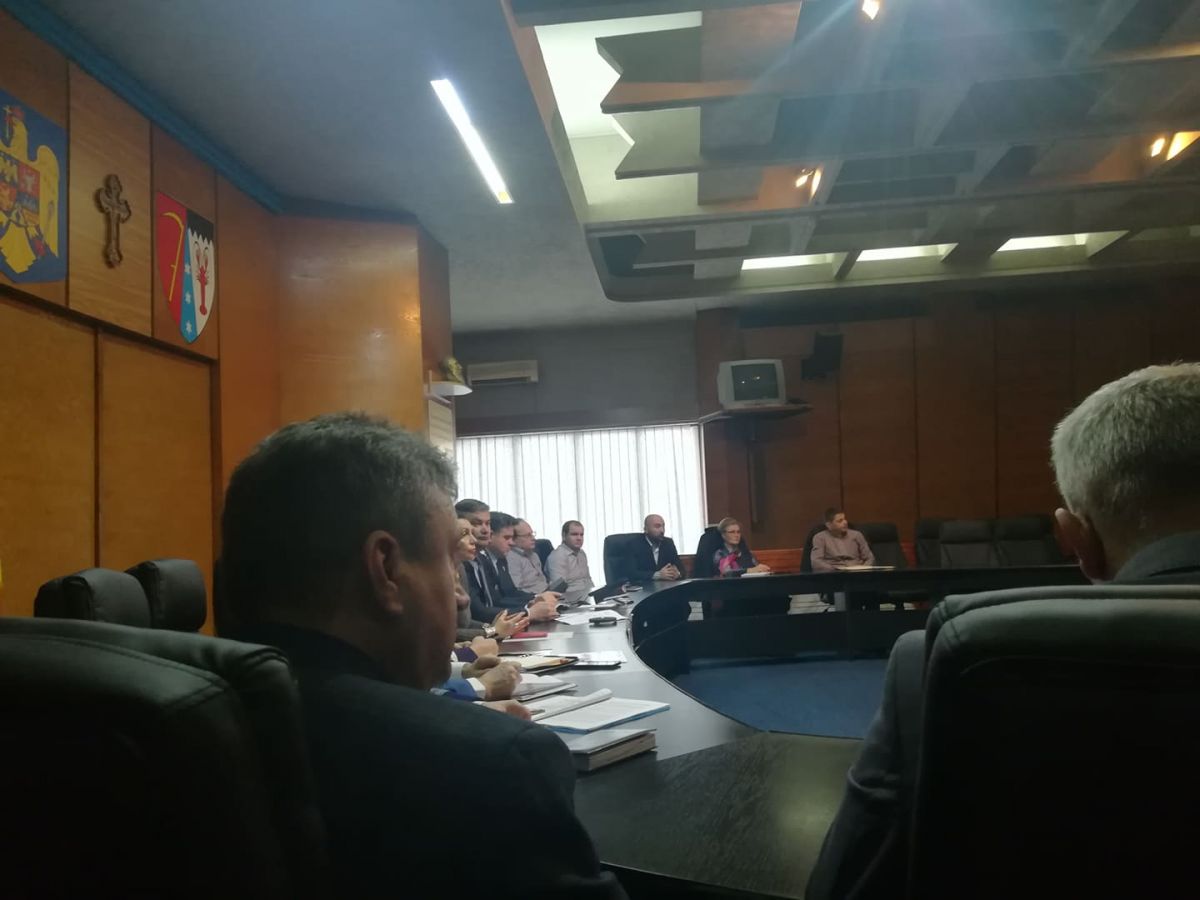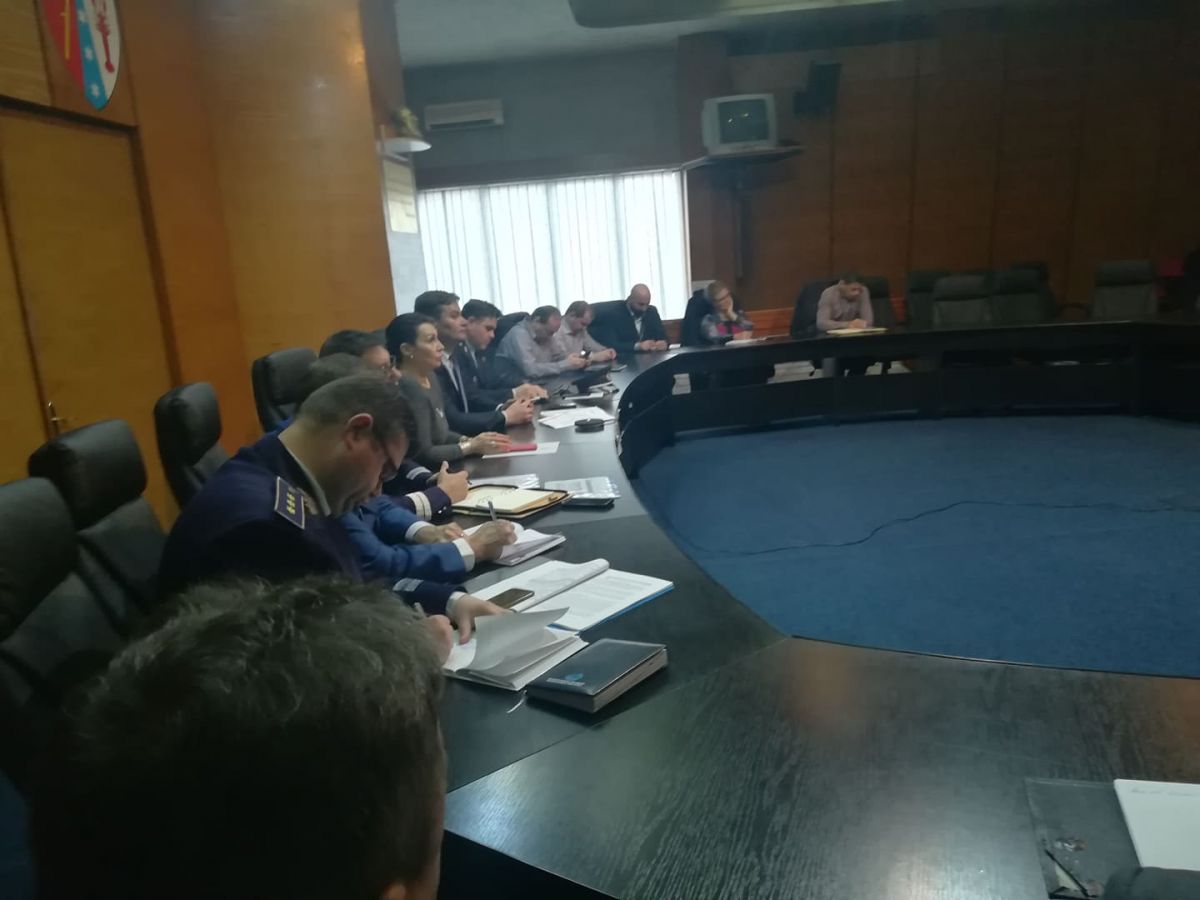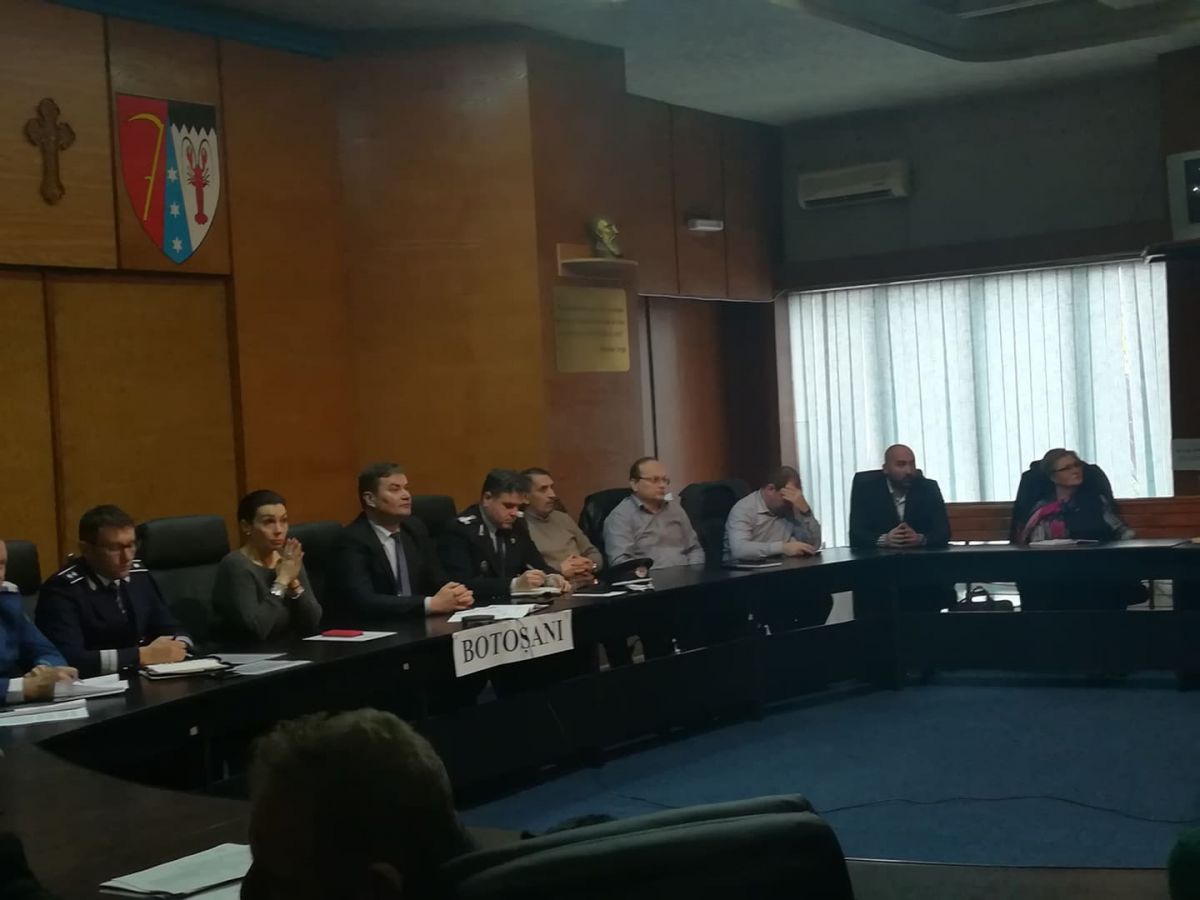 În Sala Nicolae Iorga de la Instituția Prefectului, șefi ai mai multor instituții își iau notițe.