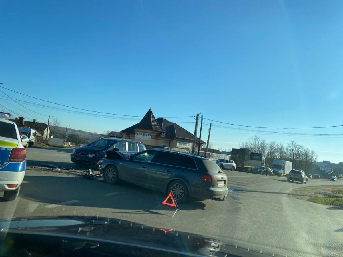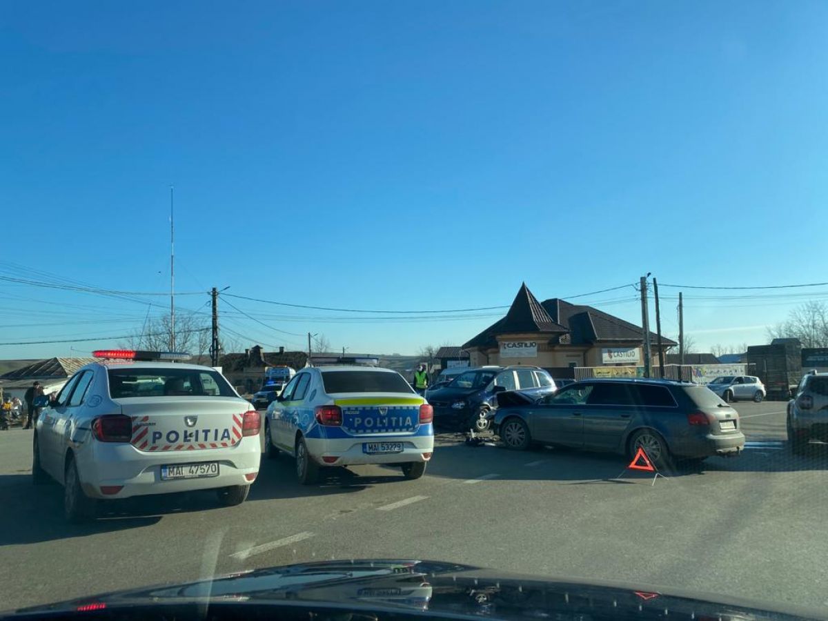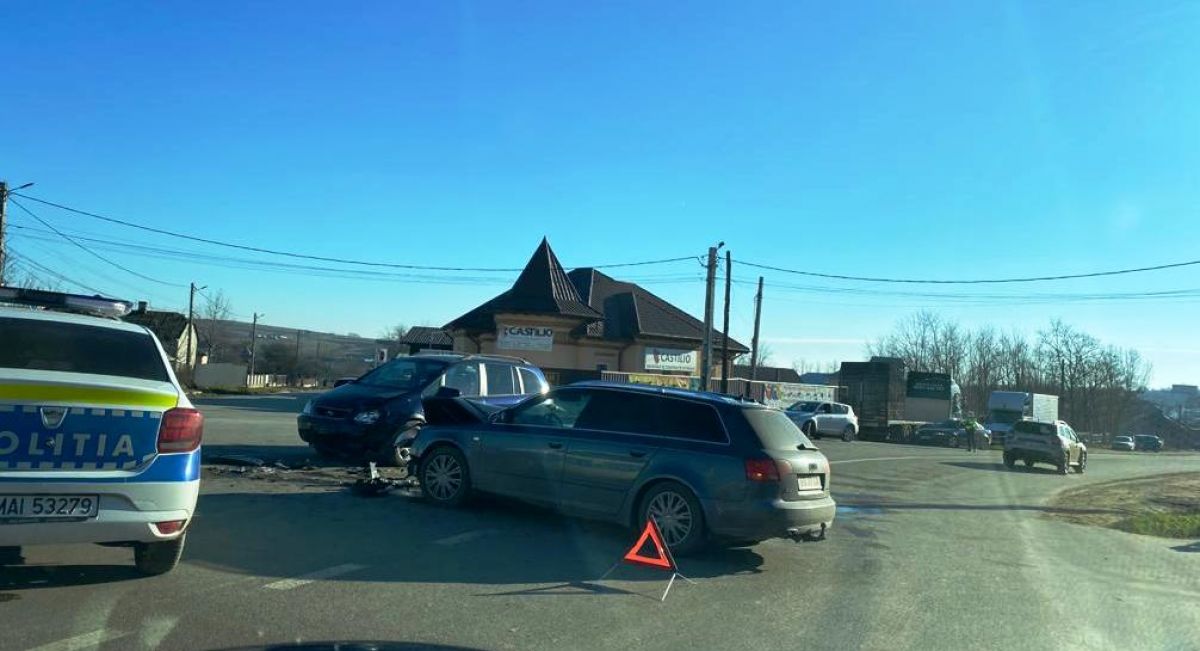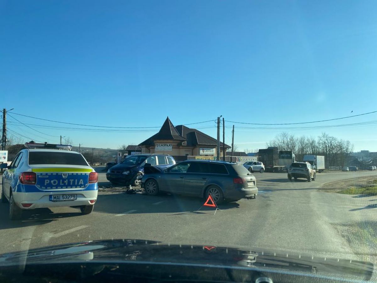 Ambele mașini au fost avariate La fața locului sunt trei echipaje de Poliție, circulația în zonă fiind dirijată.